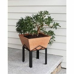 The geometric Marion Planters have a simple architectural detail characteristic of the Prairie Style, equally at home on the porch of a Craftsman bungalow, desert patio or tropical lanai. These boxy faceted planters are ideal for showing off a sculptural container mix, cactus or prized bonsai. Stands are sturdy 1-piece construction, in 2-sizes, 14 ยฝ in. with low planting container or 23-in with tall planter. Marion Planter stands are made of wrought iron with a Black powder coated finish, with planting pots made from a wood, stone and polymer blend with the warm look of rustic Terra cotta. All of our Solaria Collection plant stands and hangers are designed for indoor and outdoor use, with materials and finishes for maximum weather resistance.
