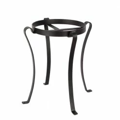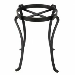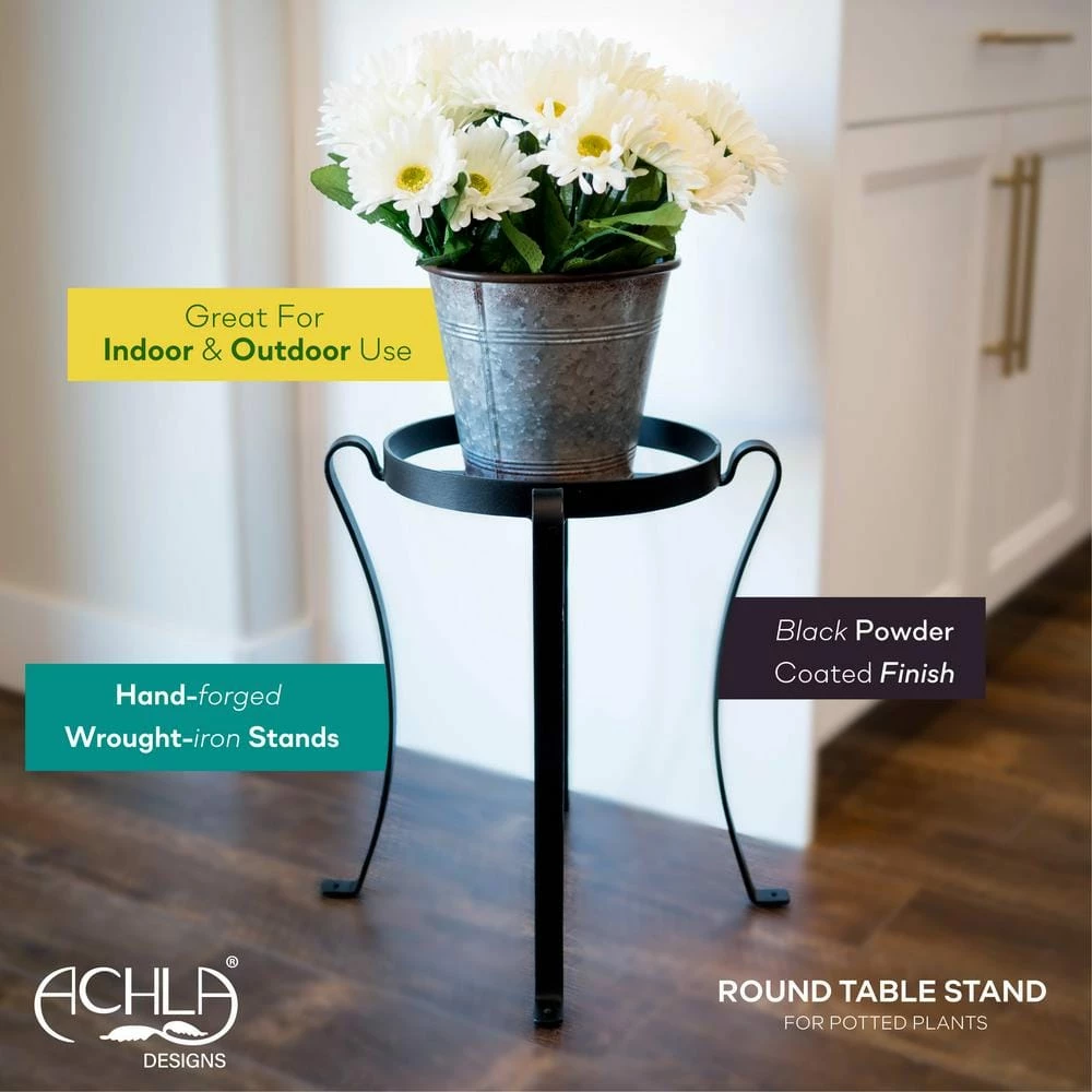 Our ACHLA DESIGNS Patio Plant Stands make an excellent addition to any home, patio, balcony, porch, terrace or garden. They have gracefully arching legs, curled feet and a sturdy construction that can support a variety of potted plants and other round containers. The top of the stand is circular and has 2 metal cross bars on which you can place a flowerpot or a planter and also features a short rim that prevents the pot from sliding off. These stands are available in 3 different sizes, making it easy for you to find 1 that fits your particular needs. The smallest stand is 7.5 in. tall and the upper rim has diameter of 10 in. The mid-sized stand is 11.75 in. tall and has a diameter of 11.75 in. The largest stand is 17.75 in. tall and has a diameter of 11.75 in. Because these plant stands are handmade, the exact dimensions of each may vary slightly. The stands are hand forged from wrought iron and have a high-quality black powder coated finish. Powder coating is a process that results in a much more durable and scratch-resistant finish than regular liquid paint. The sleek black finish gives the stand a touch of modernity, but it is neutral enough to look great anywhere. The stand looks fantastic in both indoor and outdoor settings. Indoors, the decorative plant stand can be placed in the corner of any room or entryway. Outdoors, the plant stand will look great on your patio or in your garden.