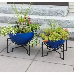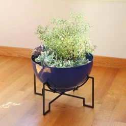 Airy and sculptural, the Jane Planters have bases made from 2-pieces that slip together forming a strong crisscross support for low, wide planting bowls. The black, square-stock bases are in bold contrast to the smooth round bowls, perfect for creating a sculptural array of succulents or cactus garden, for a mid-century patio, terrace or sunroom. In 2 sizes, the low wide planters offer many possibilities for creativity, as a stylish holiday tree stand, fairy garden or fountain. Jane Planter stands are made of wrought iron with a Black powder coated finish, with planting pots made from galvanized steel with a warm Burnt Sienna patina finish, or a bold French Blue powder coating. All of our Solaria Collection plant stands and hangers are designed for indoor and outdoor use, with materials and finishes for maximum weather resistance.