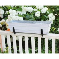 - 2 brackets included: wrought iron railing brackets measure 6 in. W (at top) x 4 in. H, and are finished with black powder coating for maximum weather resistance, 2 top-mounted brackets are included for 2 x 4 railings to hold our small cape cod white flower box planter