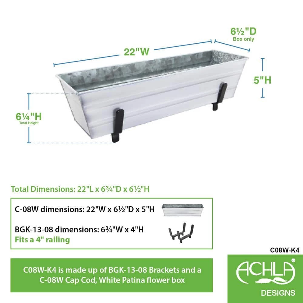 - Small cape cod white flower box included: small cape cod white blue flower box measures 22 in. L x 5 in. H, made of galvanized steel with a white-washed patina finish