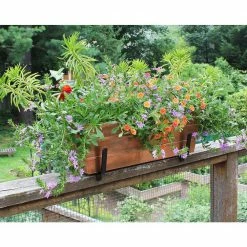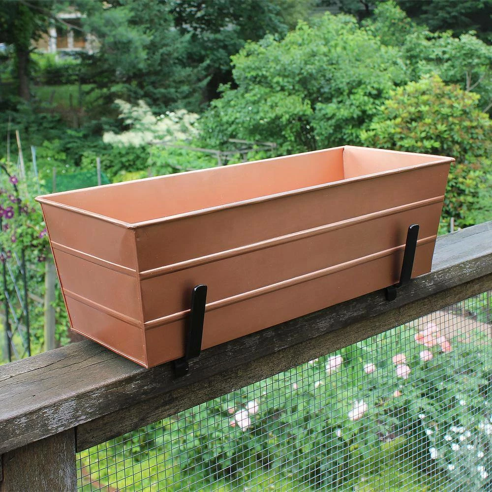 - 2 brackets included: wrought iron railing brackets measure 9.75 in. W (at top) x 5 in. H, and are finished with black powder coating for maximum weather resistance,2 top-mounted brackets for 2 x 6 railings are included to hold our medium copper flower box planter