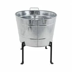 Create a container garden or use this classic farmhouse tub as a beverage chilling station. This versatile oval tub with folding wrought iron stand is stylish enough for a wine and cheese garden party or beer and soft drinks at a casual backyard cookout. The low stand lifts the tub off the ground just enough. For planting, add drainage holes or use with flowerpots and the tub becomes a great for container for growing on patios, porches or any small space garden. Use it for salad greens, strawberries, flowers and herbs. The wrought iron folding stand lifts the container up for good drainage and air circulation, keeping decks and porches clean of plant debris and staining.