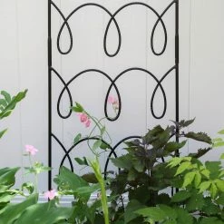- Decorative trellises: traditional metal trellis in a storybook cottage garden style, playful loops provide support for plants to climb