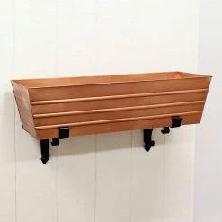 Available in three size options, these rectangular flower boxes have a rolled edge, embossed lines and a simple classic style. Made from Galvanized Steel, in three Patina finish colors, these planting containers will add curb appeal. Use them to create a lush container garden or urban balcony oasis. The Copper Plated Flower Boxes will develop warm natural patina over time that is a perfect complement to green foliage. Smallest pairs with Wall Mounted Bracket (SFB-01) Medium with Posy Flowerbox Bracket (VFB-05) Twist Flowerbox Bracket (B-06) and Wall-Mounted Bracket (SFB-02) and Largest pairs with Scrolls Bracket (B-32), Wall-Mounted Bracket (SFB-03) or Clamp-On Bracket (SFB-03C).