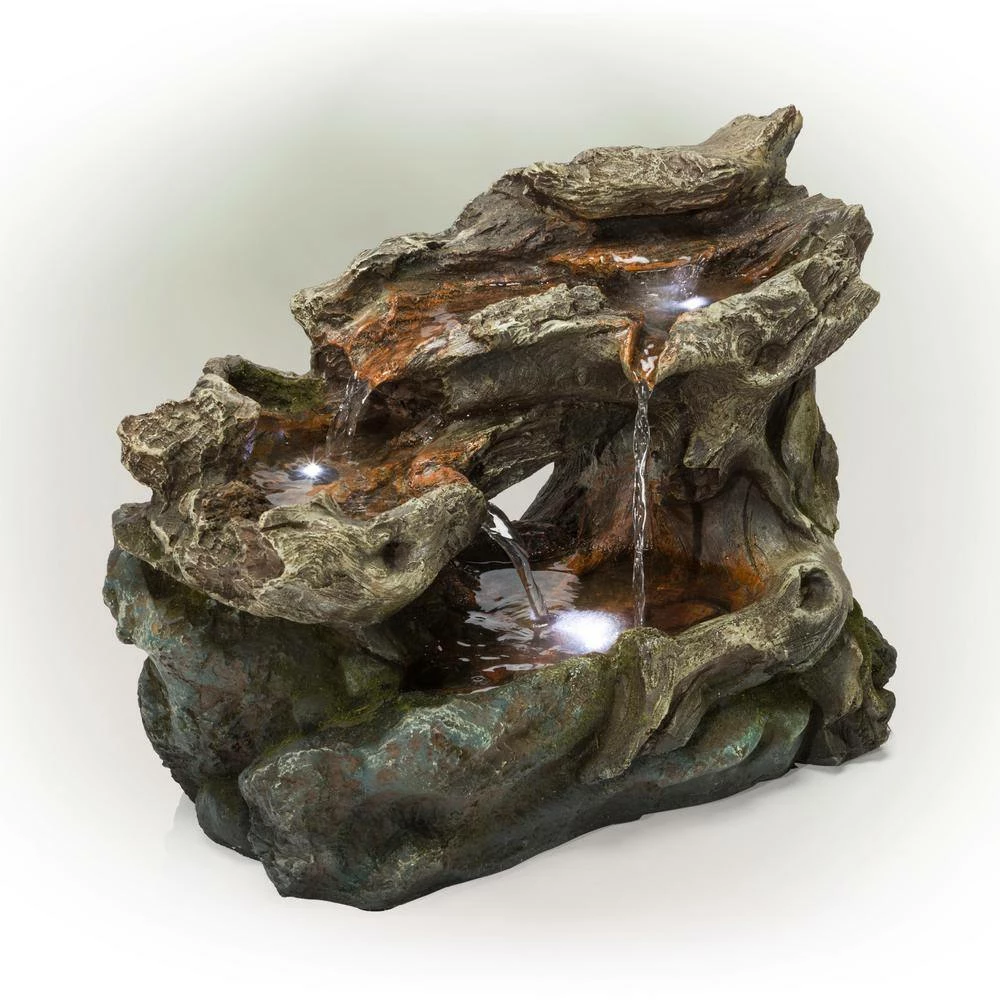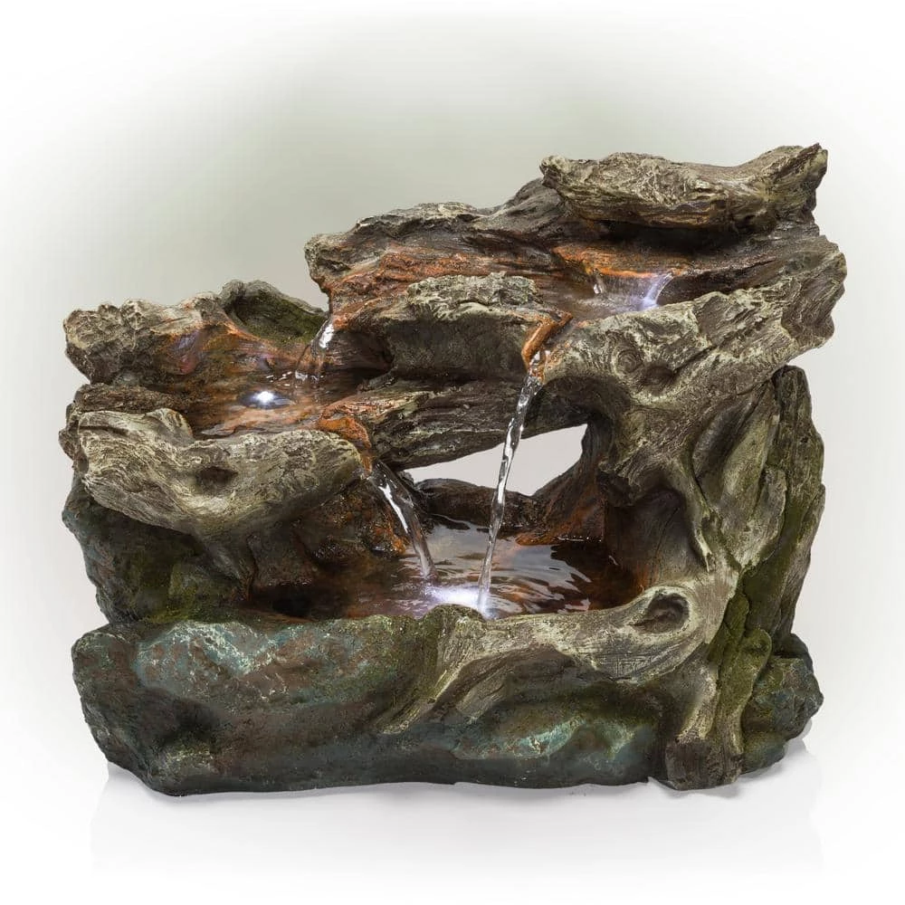 Unplug from the day and meditate to the sound of flowing water with Alpine Corporation’s 10 in. tall Outdoor 3-Tier Waterfall Rock Fountain with LED lights. This modern Zen tabletop style fountain statue provides a tranquil and soothing addition to your porch or patio. Constructed from durable polystone, fiberglass, and plastic, the fountain is weatherproof, rust-resistant, and resilient for use in your home’s interior Decor or outside. This unique and versatile decor piece includes 3 cool white LED lights for a tranquil and soothing addition to your home’s backyard or indoor decor. Replicating a rainforest scene, the fountain has a natural aged stone appearance. Relax to the sounds of the calming natural water flow as it trickles down from the top tier of the fountain into the stone pools below. For quick install and convenient operating, the fountain includes all necessary parts, including a pump, to begin creating an outdoor oasis. This fountain measures 14 in. L x 8 in. W x 10 in. H to fit almost any indoor or outdoor table space and includes a 1-year manufacturer’s warranty from date of purchase.