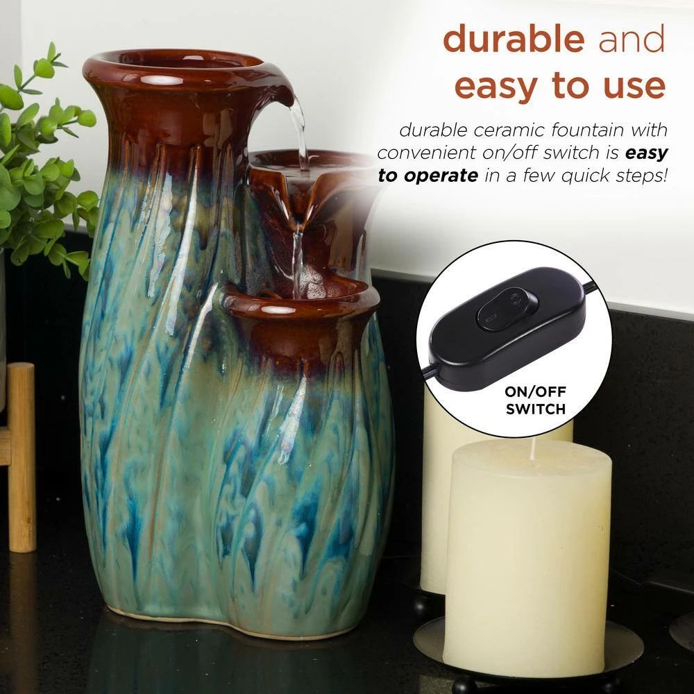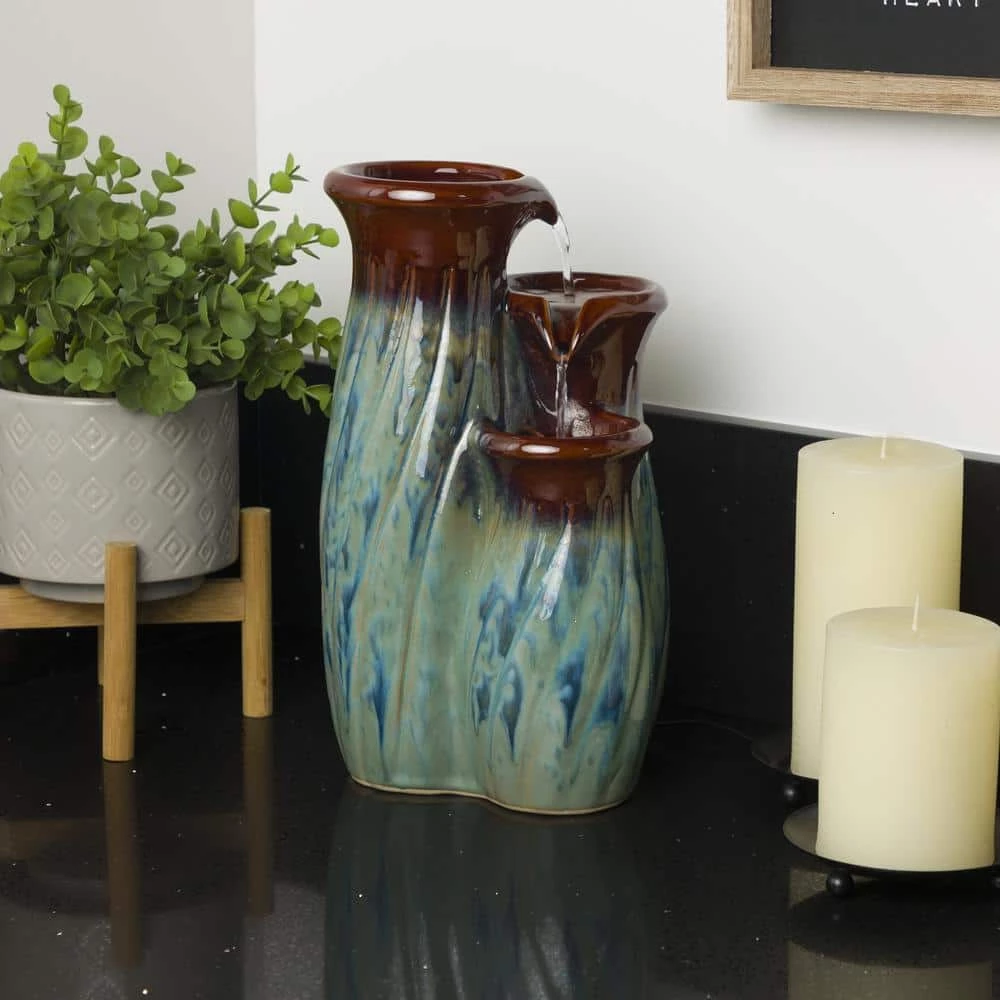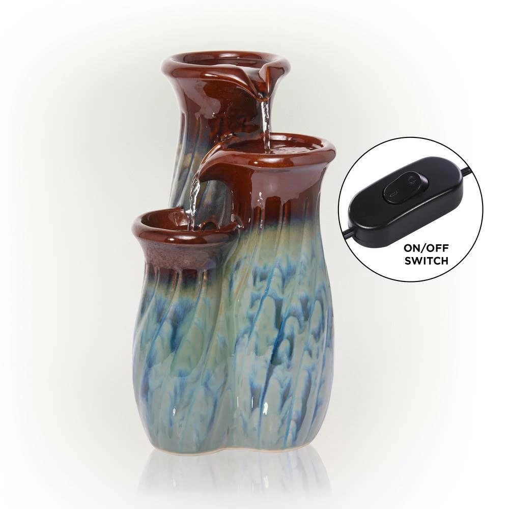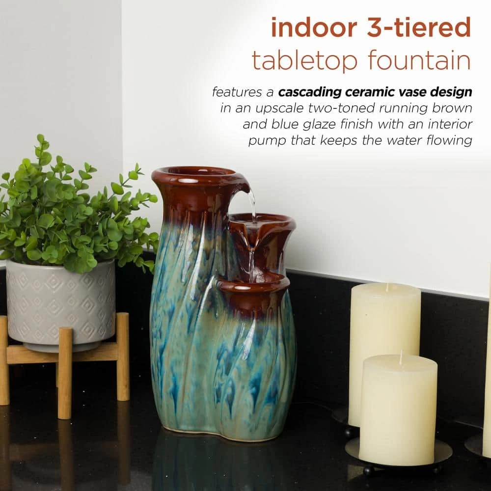 - Indoor 3-tiered tabletop fountain: features a cascading ceramic vase design in an upscale 2-toned running brown and blue glaze finish with an interior pump that keeps the water flowing – just plug it in