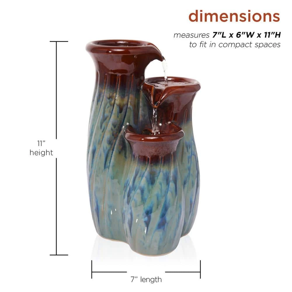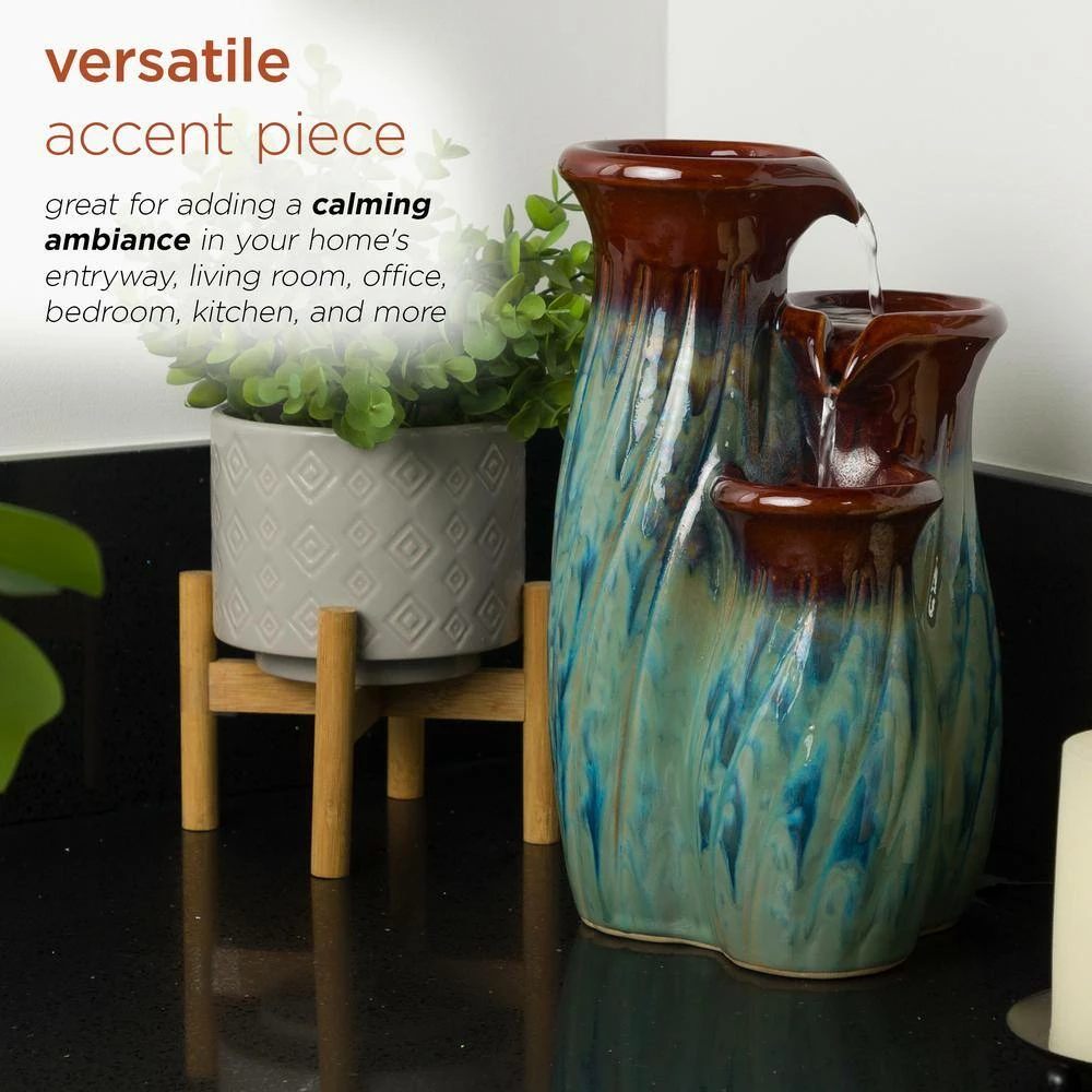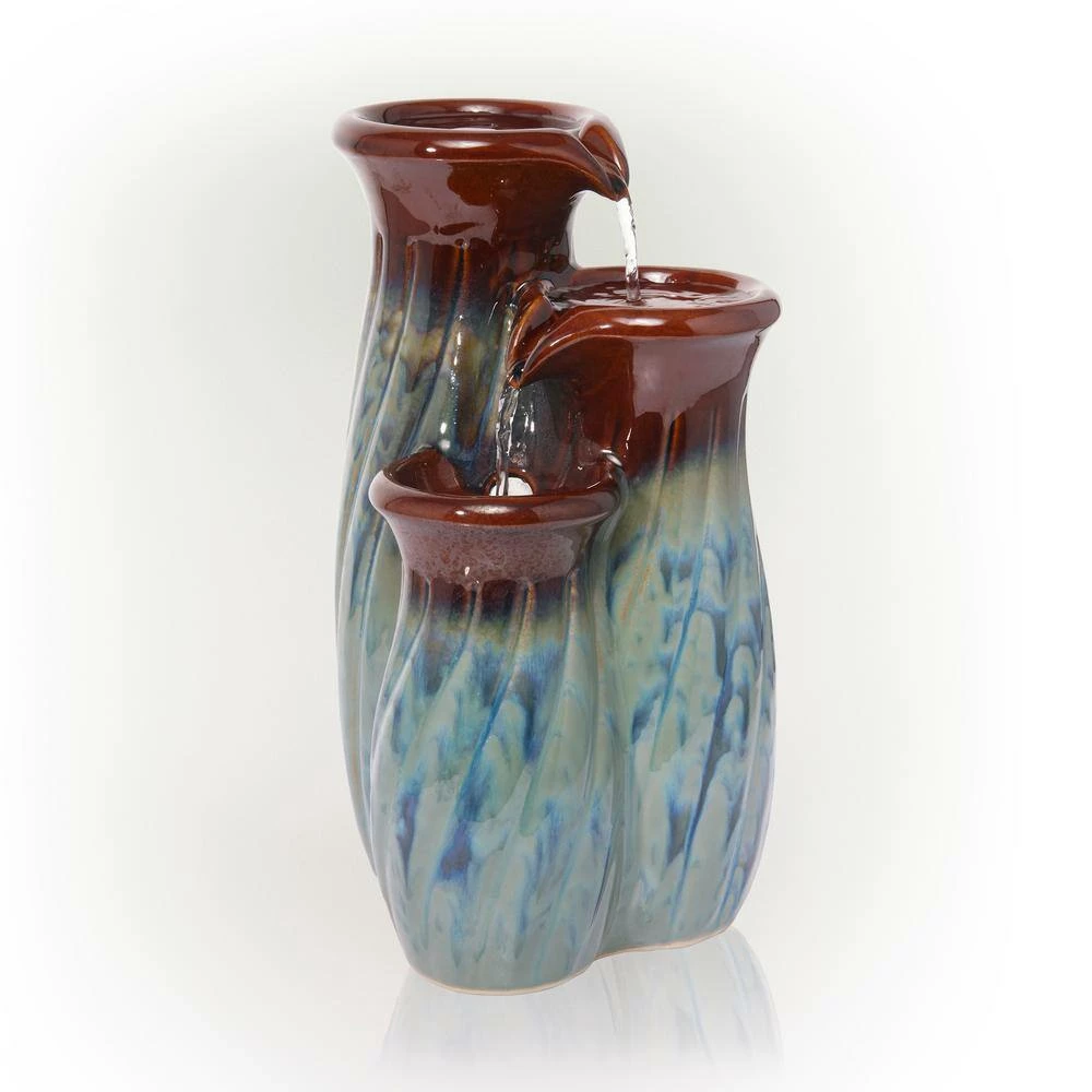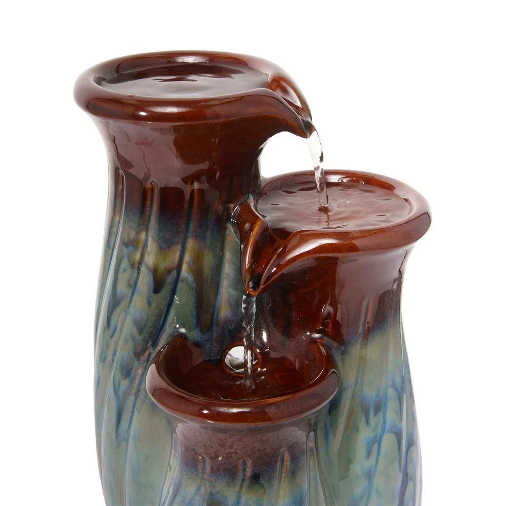- Indoor 3-tiered tabletop fountain: features a cascading ceramic vase design in an upscale 2-toned running brown and blue glaze finish with an interior pump that keeps the water flowing – just plug it in