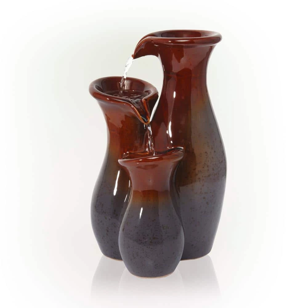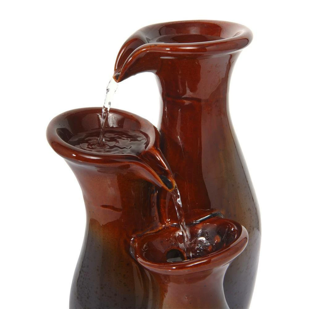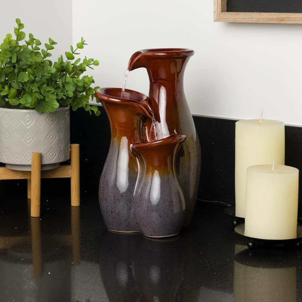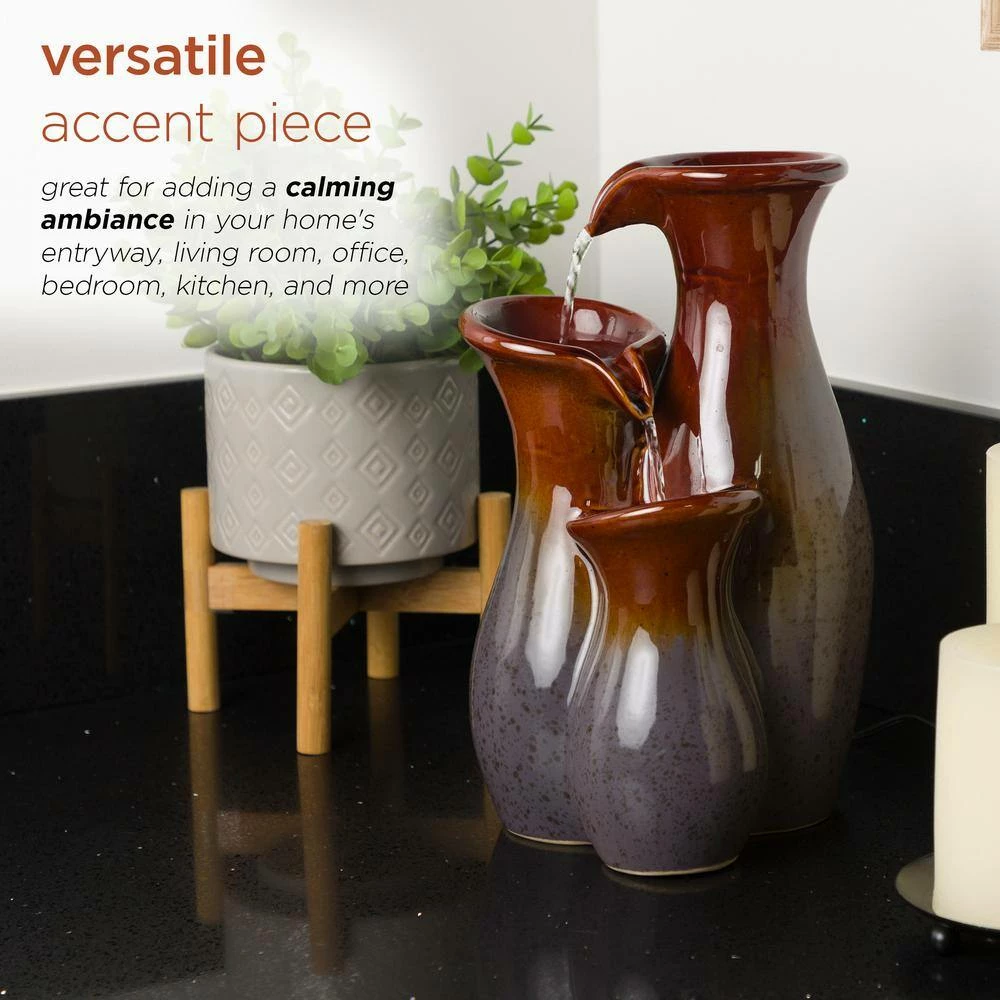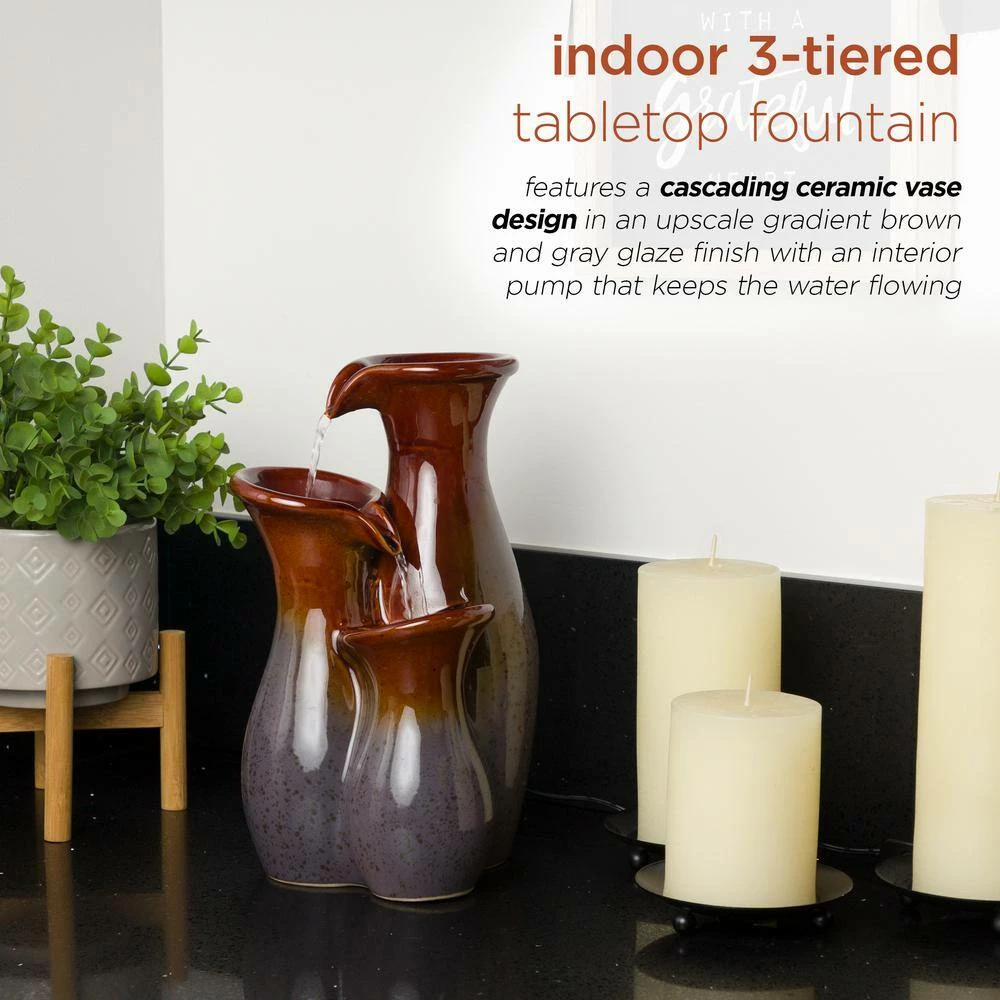 - Indoor 3-tiered tabletop fountain: features a cascading ceramic vase design in an upscale gradient brown and gray glaze finish with an interior pump that keeps the water flowing – just plug it in