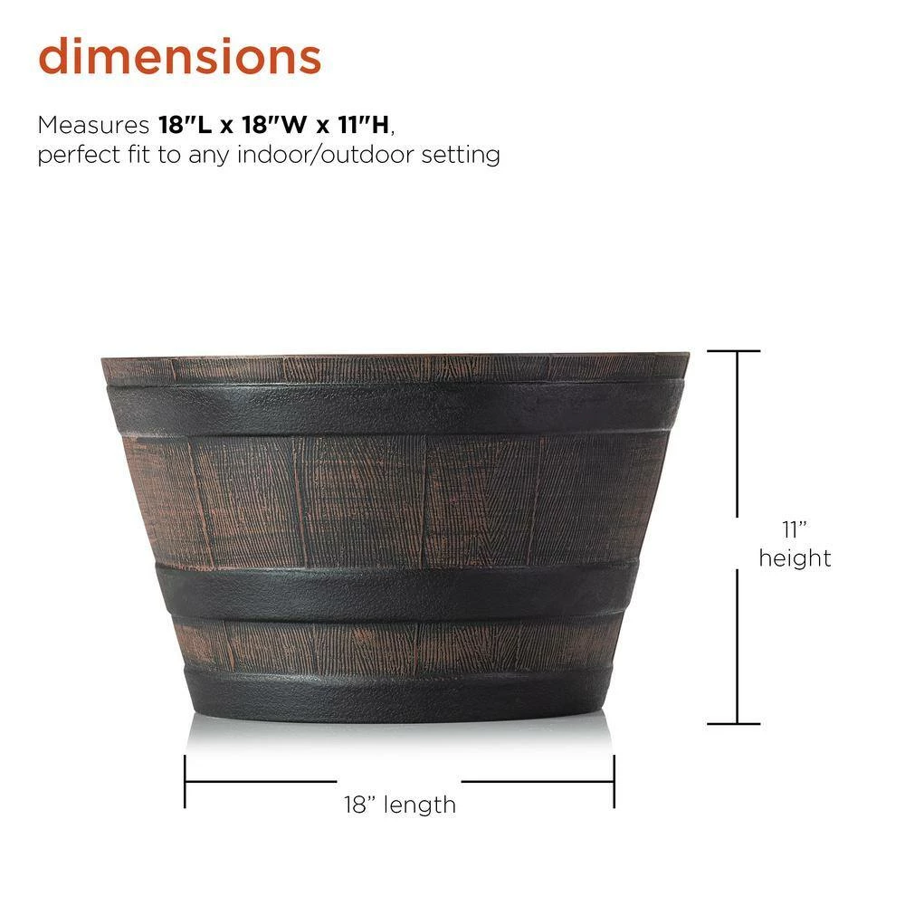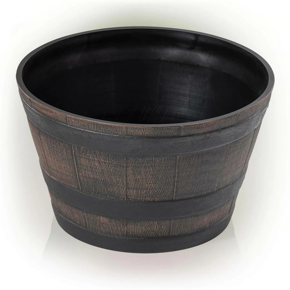 Enhance your indoor or outdoor space with the Alpine Corporation 11 in. tall Indoor/Outdoor Barrel Shaped Planter. Add your favorite flowers, plants, or herbs to this decorative flowerpot. The whiskey barrel planter flowerpot features a rustic-style bronze look and a convenient drainage hole, and adds a unique and decorative addition to your home’s interior or exterior space. Constructed from resilient and weather-resistant plastic, the barrel-shaped planter is durable and will provide long-lasting quality use in your garden or on your home’s porch, patio, or deck. With the integrated drainage hole, excess water is able to drain out after watering, letting your planted flowers grow strong and healthy. The drainage hole protects plants from rot, fungus, and bacteria. Add this versatile home Decor planter to any outdoor living area or any room in your home. The flowerpot can be used in a variety of ways, including in your flowerbeds, courtyard, or front yard or as an accent piece in your living room or front entryway. The decorative planter measures 18 in. in diameter and 11 in. high to fit almost any indoor or outdoor space, and includes a 1-year manufacturer’s warranty from date of purchase.