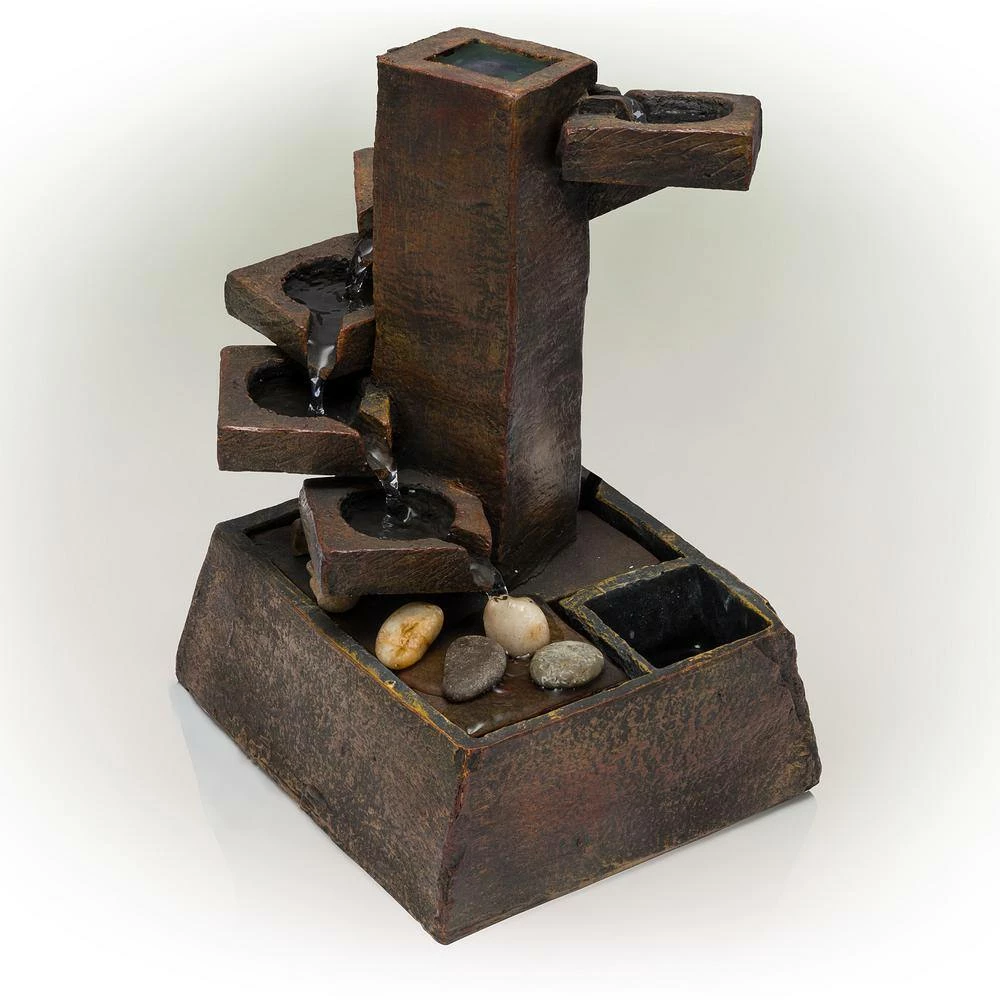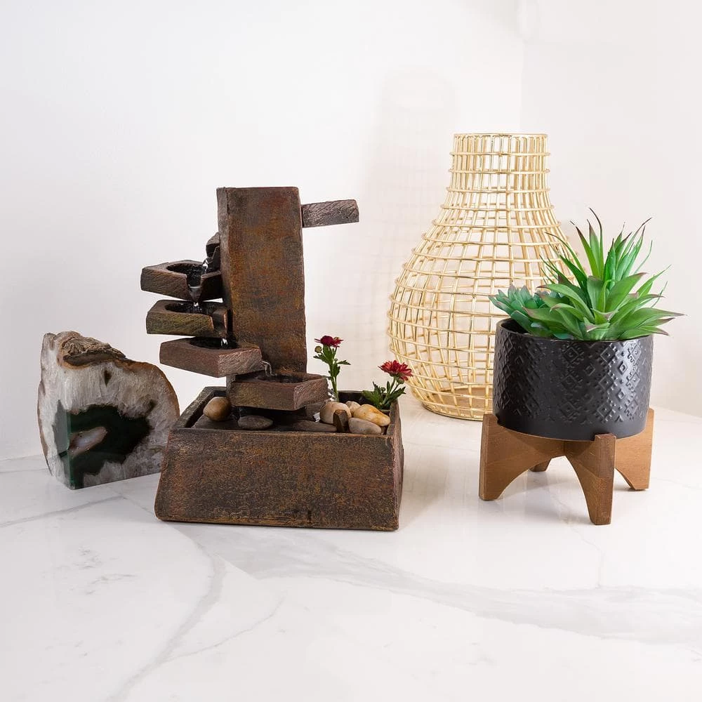 Unwind from the day and meditate to the sound of flowing water with Alpine’s 11 in. Tall Indoor/Outdoor Zen Tabletop Tiered Stone Water Fountain with Mini Plant Holder. This modern zen tabletop style fountain statue provides a tranquil and soothing addition to your porch, patio or home office. Constructed from durable resin and stone powder, the fountain is weatherproof, rust-resistant, and resilient and can be used in your home’s interior Decor or outside. This unique and versatile decor piece will provide a tranquil and soothing addition to your home’s backyard, indoor or office decor. Replicating a traditional zen garden, the fountain has a natural aged stone appearance, comes with river stones and a mini holder perfect for planting you favorite flower, plant or herb. Relax to the sounds of the soft, calming natural water flow as it trickles down from the top tier of the fountain all the way down the tiers to the rocks below. This modern and contemporary style fountain provides a perfect addition to your courtyard, patio, or yard, and gives your garden or tabletop visual interest with its natural waterfall style. For quick install and convenient operating, the fountain includes all necessary parts and a pump, to begin creating an outdoor oasis. This fountain measures 9 in. L x 8 in. W x 11 in. H to fit almost any indoor or outdoor table space and includes a 1-year manufacturer’s warranty from date of purchase.