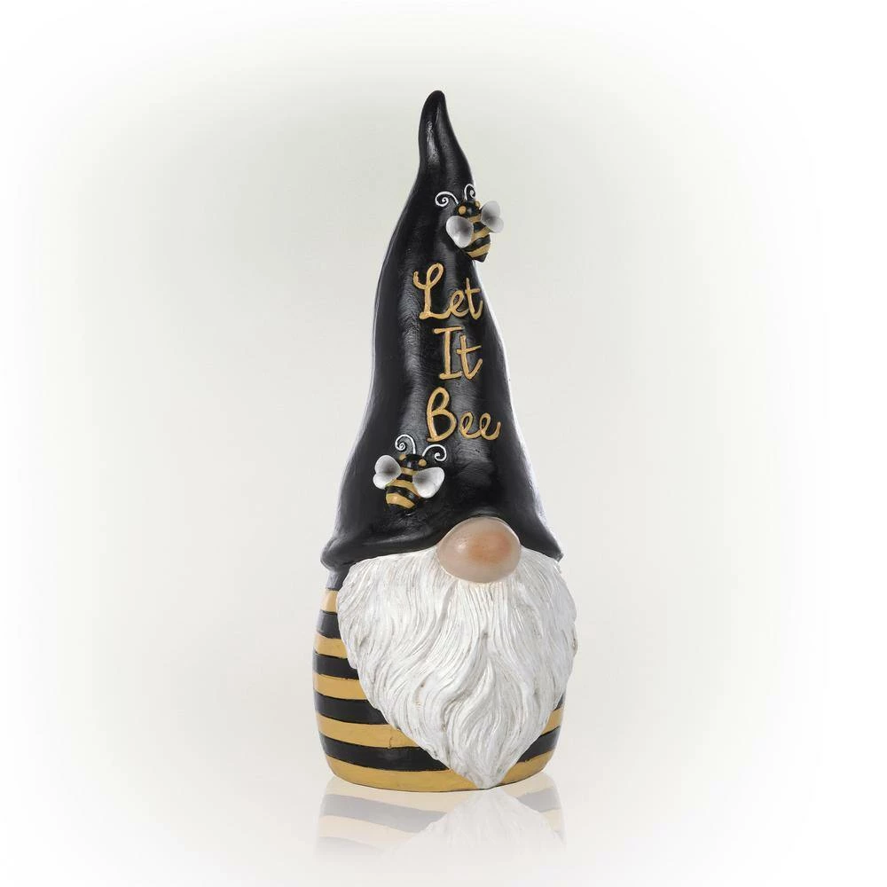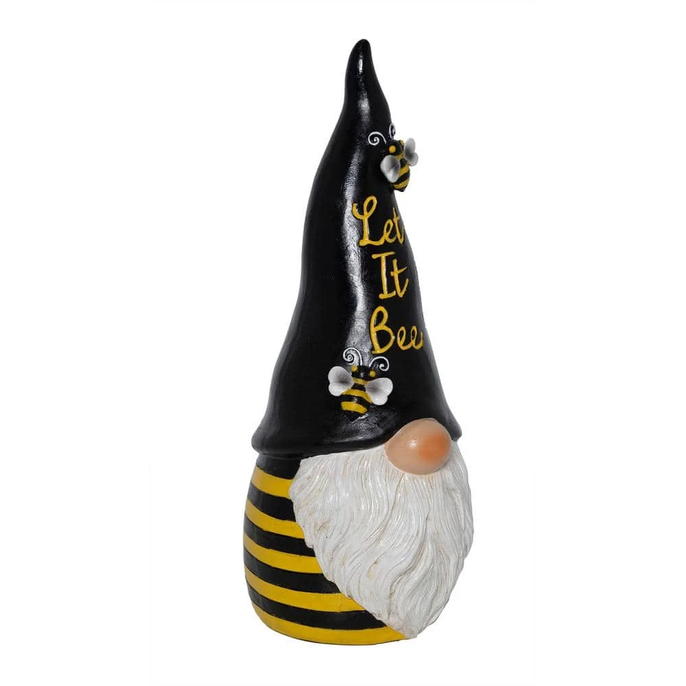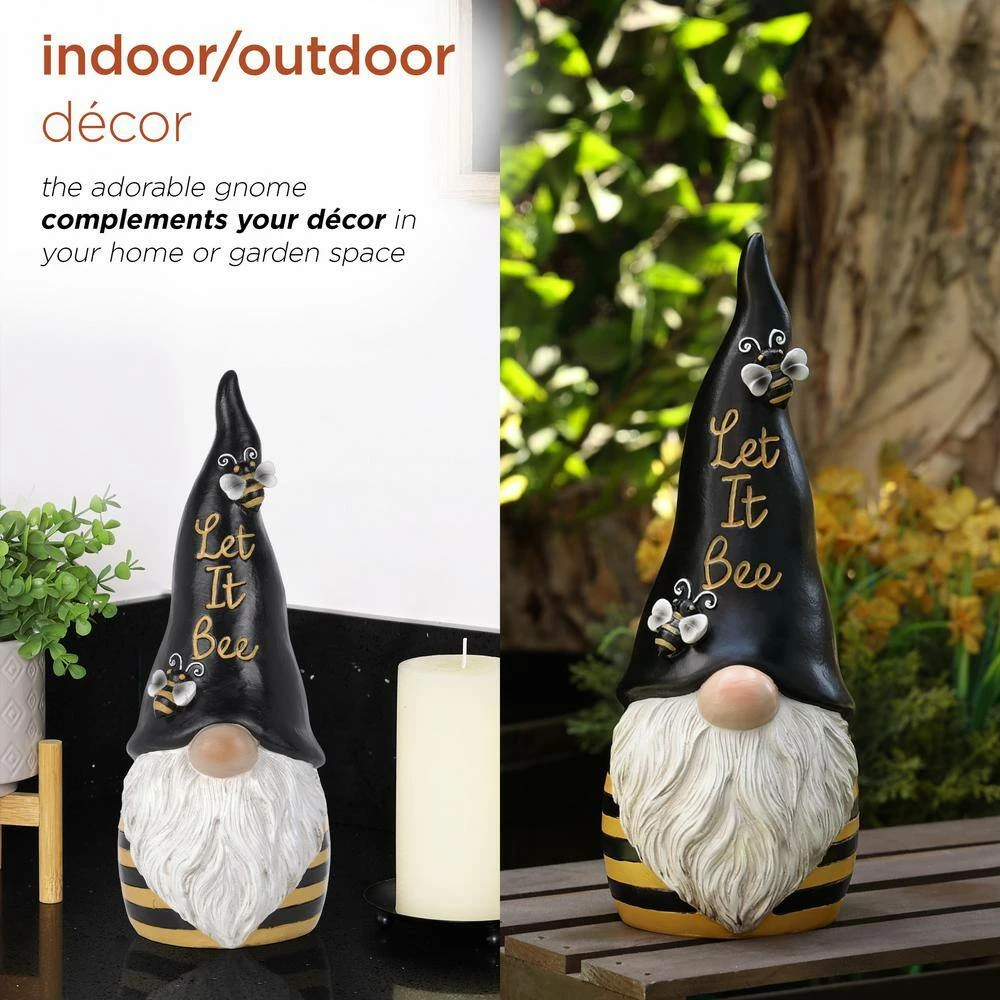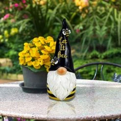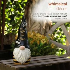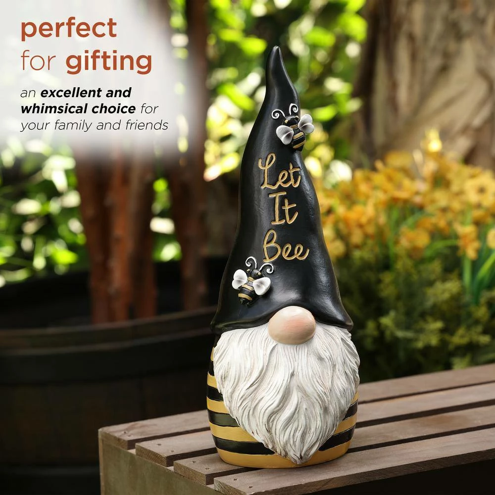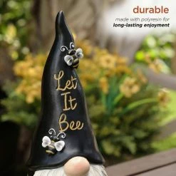 - Outdoor garden gnome: playful garden gnome with bumblebee friends wearing a striped sweater and black hat that reads “Let it bee” Offers a warm welcome to your guests