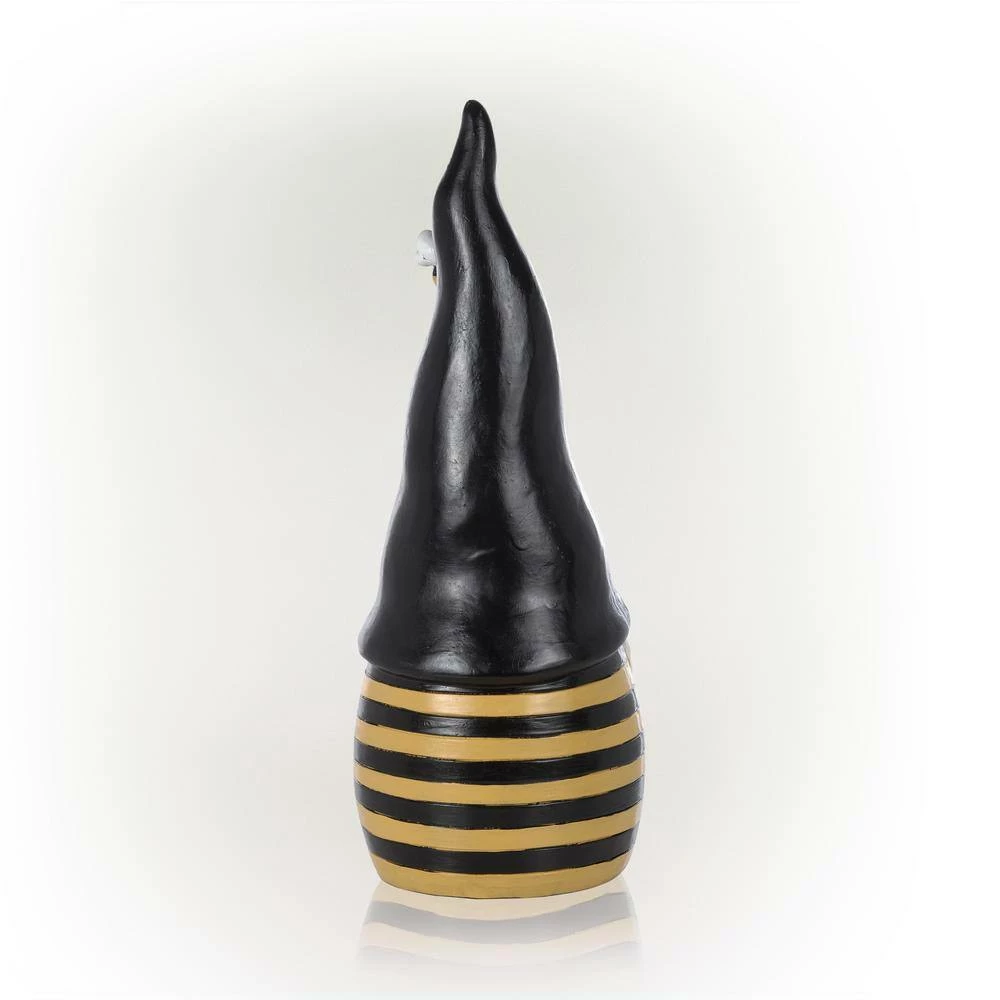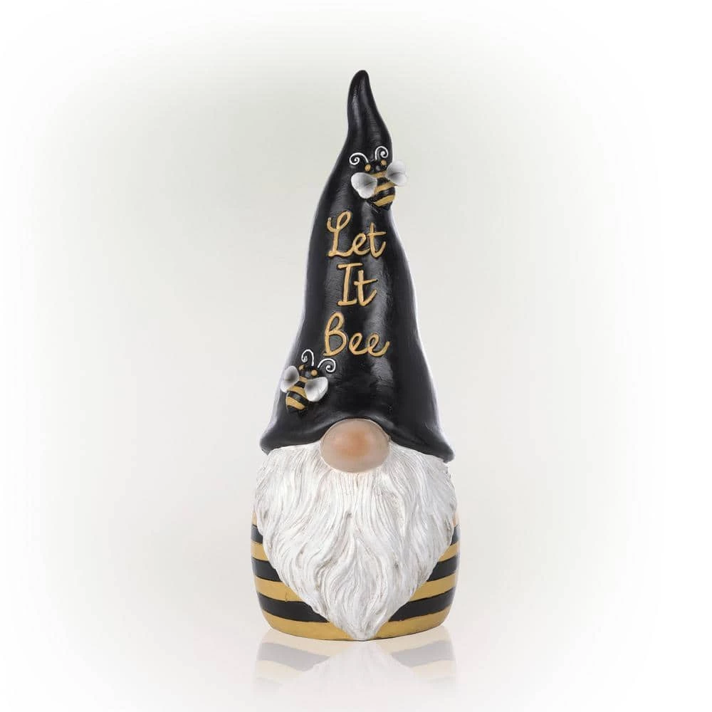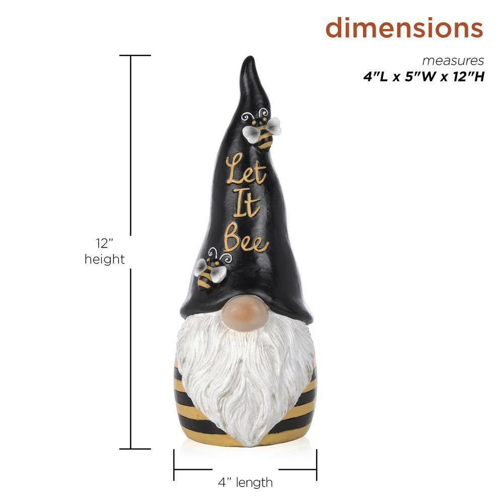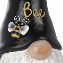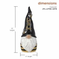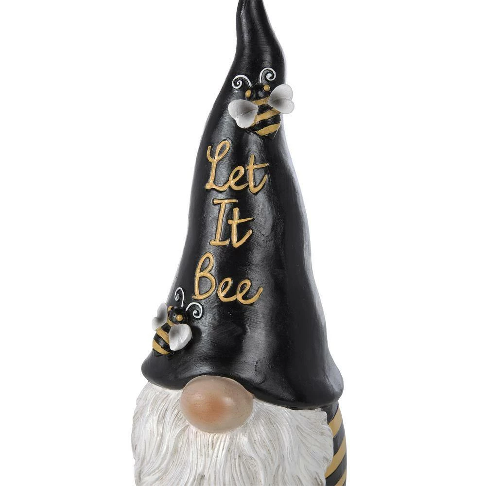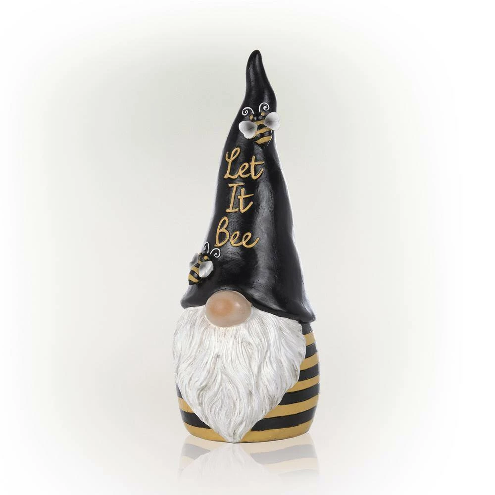 - Outdoor garden gnome: playful garden gnome with bumblebee friends wearing a striped sweater and black hat that reads “Let it bee” Offers a warm welcome to your guests