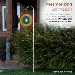 Add vibrant color and magical 3D motion to your outdoor space with the Alpine Corporation Hanging Metal Planet Wind Spinner. This captivating wind spinner is designed with rainbow-colored flowers, created with laser-cutting technology, orbiting a clear glass ball to offer stunning movement and motion. This hanging spinner can be placed on its own or paired with multiple spinners along your patio, porch, driveway or pathway to create a mesmerizing outdoor display. The durable stainless steel construction with glass ball is designed for long-lasting and all-season outdoor use and it is easy to clean to maintain its reflective shine and vibrant colors. This windmill spinner measures 12 in. L x 2 in. W x 12 in. H with a hanging height of 15 in. (stake not included) to make a statement in your yard and includes a 1-year manufacturer’s warranty from date of purchase. Alpine Corporation is one of America’s leading designers, importers and distributors of superior quality home and garden decor products. Alpine’s award winning in-house design team continuously develops new and innovative “statements pieces” for your home and garden. Your outdoor living spaces will be the envy of the neighborhood with our wide assortment of fresh, fashionable and contemporary products, from beautifully crafted solar garden stakes featuring patented motion and fiber optic lighting technology to beautiful fountains and delightful bird baths and feeders.