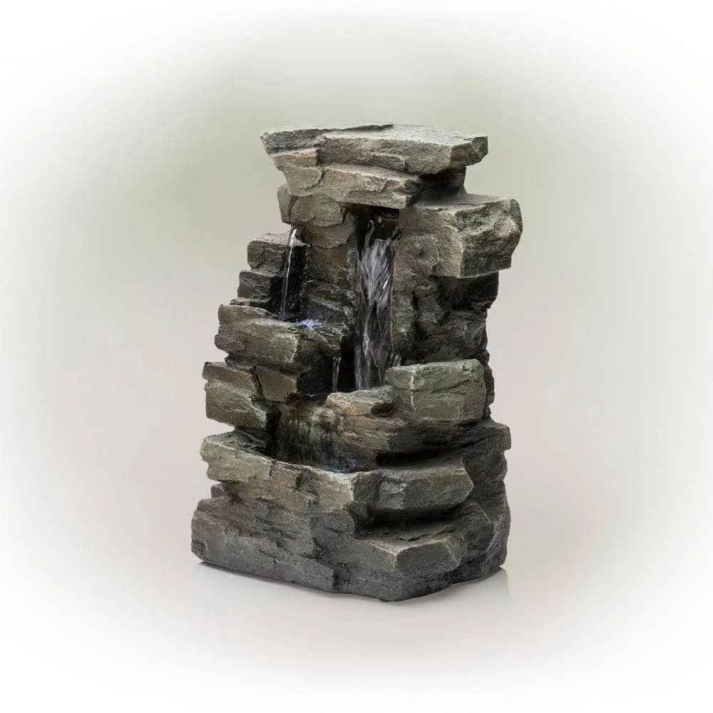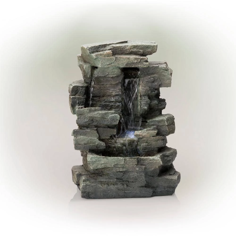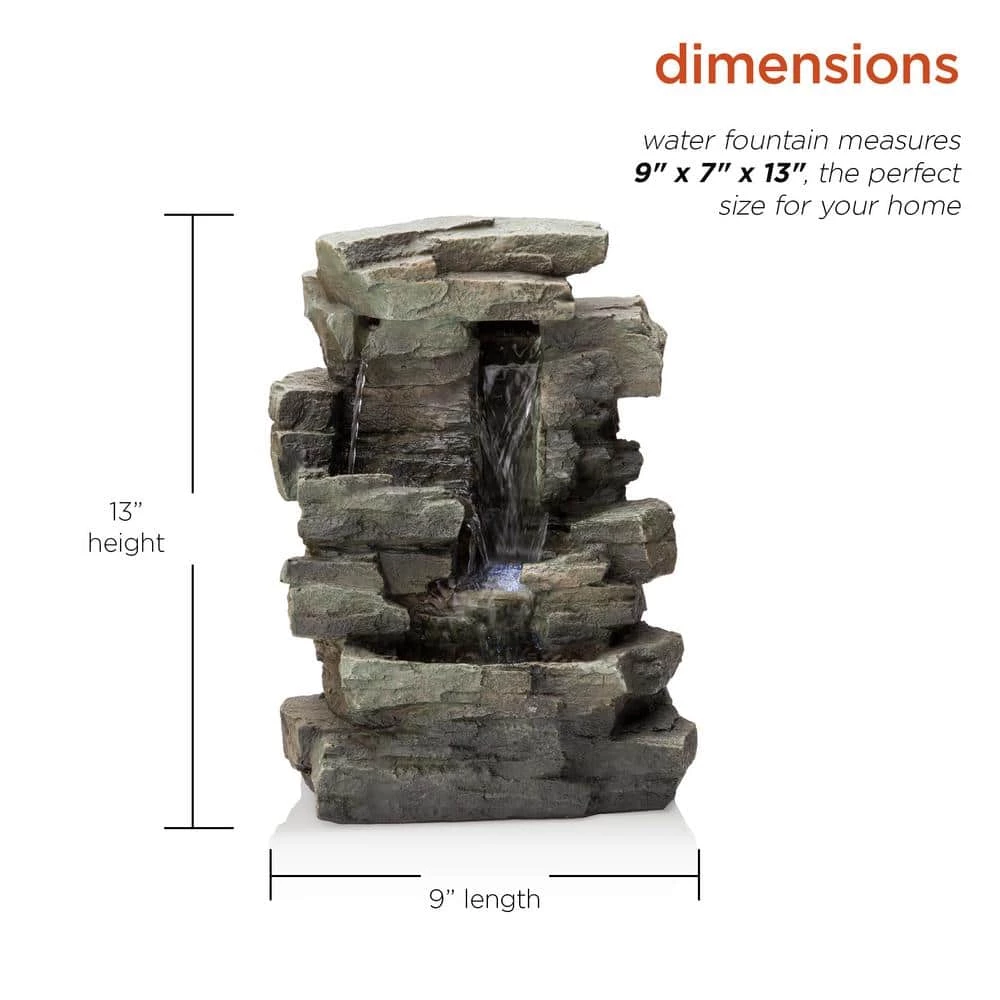 Enjoy the meditative sounds of nature indoors with the Alpine Corporation Cascading Tabletop Fountain. Take in the tranquil sounds of the water gently cascading over natural-looking grey stone in the comfort of your own home. This fountain is perfect for tabletops in your office, entryway, or out on your patio or yard. The resin, stone powder, and fiberglass construction is weatherproof, rust-resistant, and durable for years of quality use. LED lights illuminate your space, drawing attention to the relaxing water pools day or night for added ambiance. To use, simply plug into an outdoor outlet, fill lower level with water, and watch as the interior pump creates a lovely water flow reminiscent of a lush rainforest. With a 1-year warranty, you can be confident in the quality of your purchase. Fountain measures 9 in. L x 7 in. W x 13 in. H, perfect for tabletops.Alpine Corporation is one of America’s leading designers, importers, and distributors of superior quality home and garden Decor products. Alpine’s award winning in-house design team continuously develops new and innovative “statements pieces” for your home and garden. Your outdoor living spaces will be the envy of the neighborhood with our wide assortment of fresh, fashionable and contemporary products, from beautifully crafted solar garden stakes featuring patented motion and fiber optic lighting technology to gorgeous glass and glow-in-the-dark birdbaths and feeders.