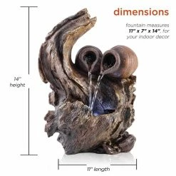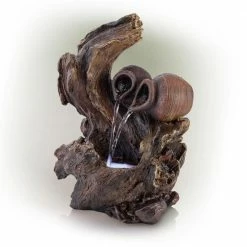 Relax and enjoy the sounds of nature with the Alpine Corporation Two Jars on a Tree Branch Fountain. Take in the tranquil sounds of the water gently cascading over natural-looking aged wood logs. This indoor fountain adds a natural look to your home, office, garden, patio, deck, or yard space. The resin, stone powder, and fiberglass construction is weatherproof, rust-resistant, and durable for years of quality use. To use, simply plug into an outlet, fill lower level with water, and watch as the interior pump creates a lovely water flow reminiscent of a lush rainforest. With a 1-year warranty, you can be confident in the quality of your purchase. Fountain measures 11 in. L X 7 in. W X 14 in. H for use in yards of any size and appropriate tables.Alpine Corporation is one of America’s leading designers, importers, and distributors of superior quality home and garden Decor products. Alpine’s award winning in-house design team continuously develops new and innovative “statements pieces” for your home and garden. Your outdoor living spaces will be the envy of the neighborhood with our wide assortment of fresh, fashionable and contemporary products, from beautifully crafted solar garden stakes featuring patented motion and fiber optic lighting technology to gorgeous glass and glow-in-the-dark birdbaths and feeders.