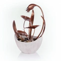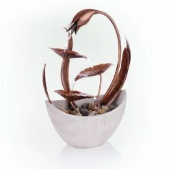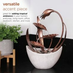 Bring tranquility to your space with the Alpine Corporation 15 in. H Multi-Tier Metal Floral Leaf Tabletop Fountain. This unique fountain features tiered flowers and leaves with a stone-filled base and an interior pump that keeps the water flowing – just plug it in. This versatile Zen fountain is great for adding tropical ambiance in your home’s entryway, living room, office, bedroom, kitchen and more. The tranquil sounds of water gently cascading down the flowers and leaves creates a calm and relaxing atmosphere while blocking out other noises. The durable plastic and metal construction provides long-lasting indoor use. To start using the fountain, simply plug in the 6 ft. cord, fill with water and turn the switch on to start the calming water flow. This tabletop-sized fountain measures 10 in. L x 7 in. W x 15 in. H to fit in compact spaces and it includes a 1-year manufacturer’s warranty from date of purchase. Alpine Corporation is one of America’s leading designers, importers and distributors of superior quality home and garden decor products. Alpine’s award winning in-house design team continuously develops new and innovative “statements pieces” for your home and garden. Your outdoor living spaces will be the envy of the neighborhood with our wide assortment of fresh, fashionable and contemporary products, from beautifully crafted solar garden stakes featuring patented motion and fiber optic lighting technology to beautiful fountains and delightful bird baths and feeders.