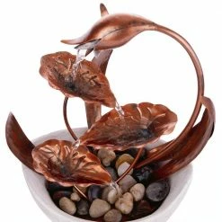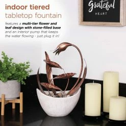 - Indoor tiered tabletop fountain: features a multi-tier flower and leaf design with stone-filled base and an interior pump that keeps the water flowing – just plug it in