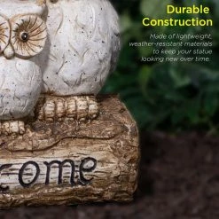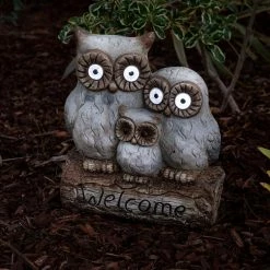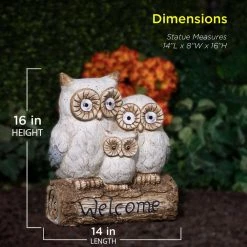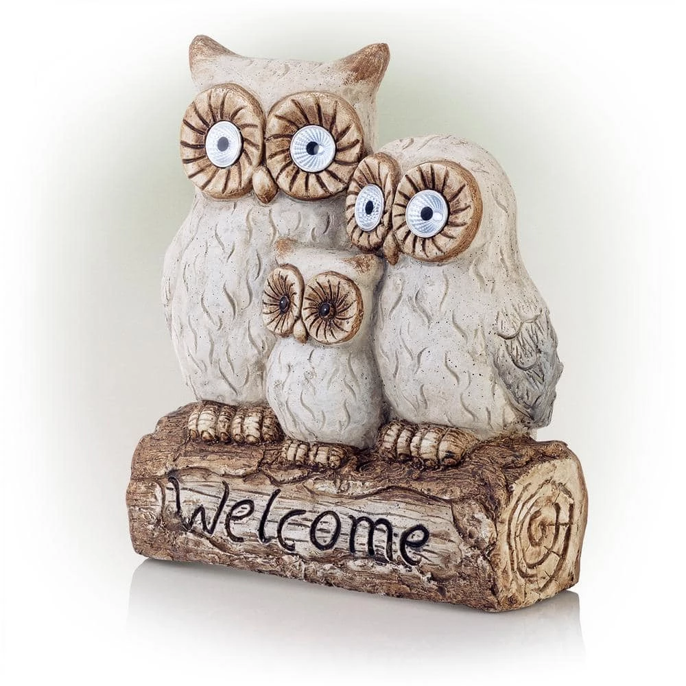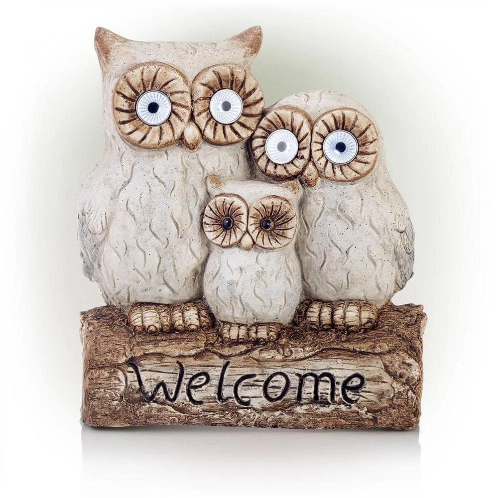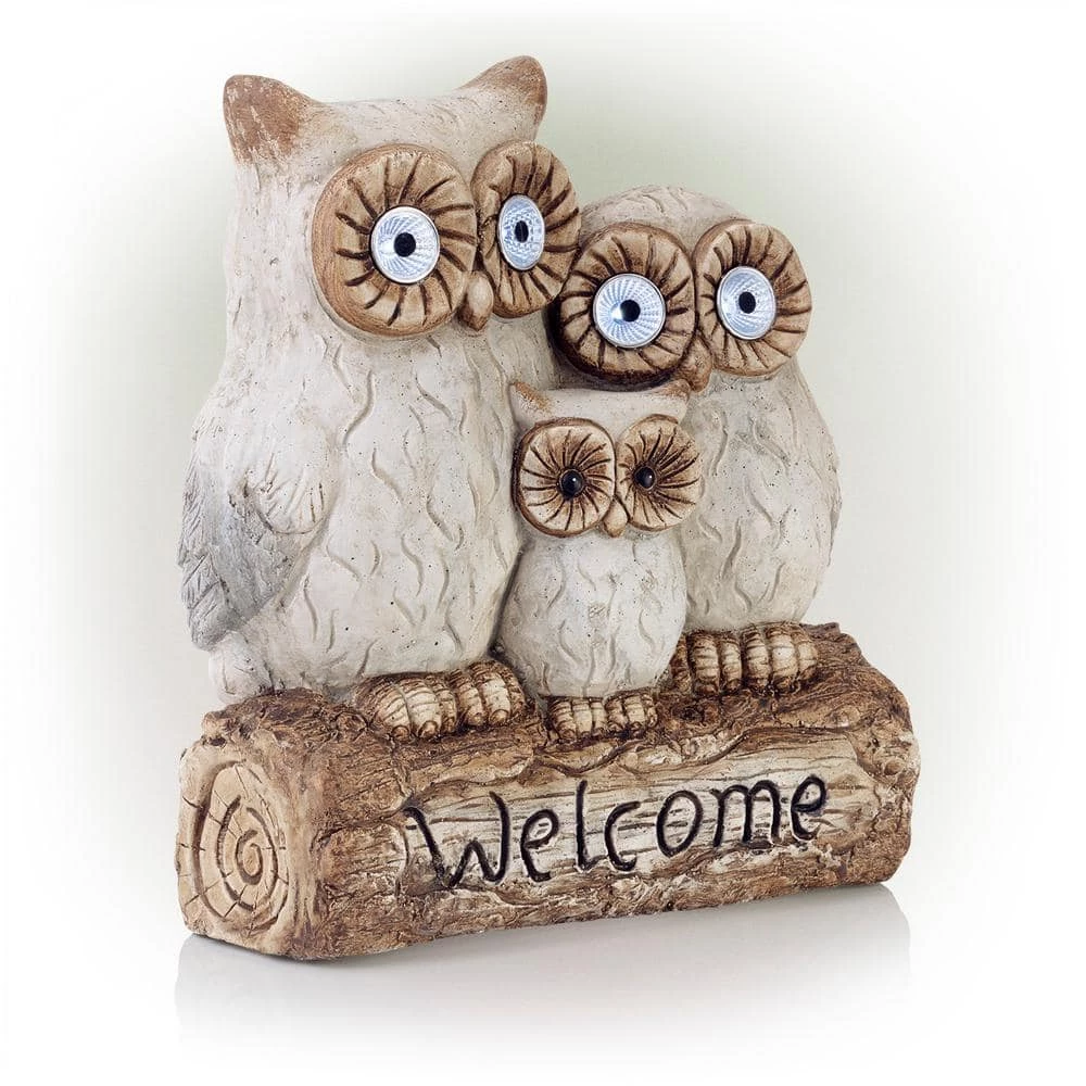 Welcome your house guests with this warm and inviting outdoor statue from Alpine Corporation. The Solar Powered Owl Family “Welcome” Statue with LED Lights features three owls powered by solar energy that provide a unique and charming addition to your home’s exterior Decor. The statue features an owl family sitting on a log ready to greet your visitors. The lighted yard art is powered by solar energy to keep your outdoor yard statue lit up for up to 8 hours on one full charge and features 2 pairs of LED lights located in the larger owls’ eyes. Constructed from durable magnesia, the yard art is made tough for outdoor use and is weather-resistant for long-lasting, quality use on your porch, patio, or flowerbeds. Add one or multiple statues to create an enchanted garden display. The welcome sign is perfect for display on pathways, entryways, decks, courtyards, and outdoor living spaces. The outdoor garden statue measures 14 in. L x 8 in. W x 16 in. H to fit almost any outdoor space, and includes a 1-year manufacturer’s warranty from date of purchase.