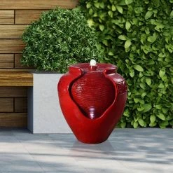 - Indoor/outdoor fountain: features a bright cherry red vase with an interior pump that keeps the water flowing – just plug it in