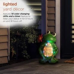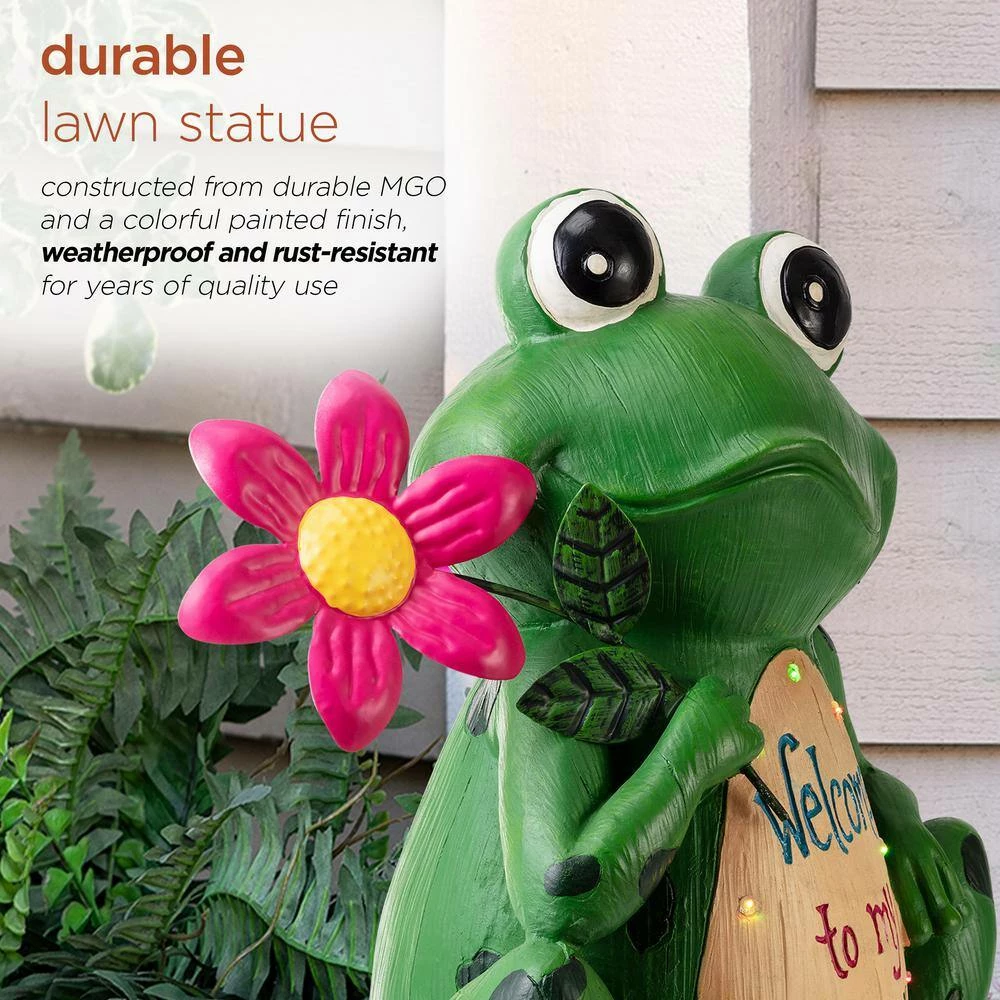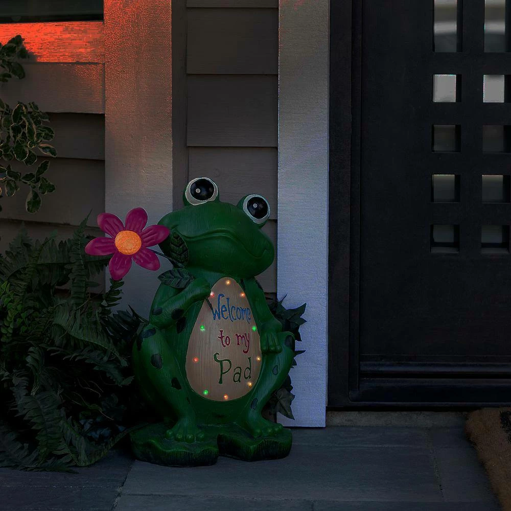 - Outdoor statue: lawn figurine featuring an adorable frog with “welcome to my pad” on its belly and 10 color changing LED lights, will bring fun and a warm welcome to your front yard, garden, or patio