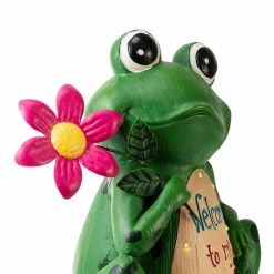 Add a touch of whimsy to your outdoor space with the Alpine Corporation 18 in. tall Outdoor Frog with Color Changing LED Lights and Welcome Sign Yard Statue. The lawn figurine featuring an adorable frog with “Welcome to my Pad” on its belly and 10 color changing LED lights, will bring fun and a warm welcome to your front yard, garden, patio, or outdoor area. This lovely statue is constructed with durable magnesium oxide with a colorful painted finish to match any outdoor decor. The statue is weatherproof, rust-resistant, and durable for years of quality use. The outdoor statue features 10 color-changing LEDs and a timer feature to keep your statue lit for 6 hours on and 18 hours off, making it ideal for placing outdoors to welcome guests. Add multiple statues to create an enchanted garden display. Alpine Corporation’s yard statues are perfect for display on your deck, porch, or outdoor living area. They can also be used as a decorative accent in your flowerbeds or in your home’s interior decor. This lighted outdoor statue measures 12 in. L x 9 in. W x 18 in. H and is powered by 2 AA batteries (not included), and includes a 1-year manufacturer’s warranty from date of purchase.