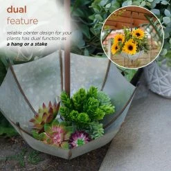 Create an inviting walkway or enhance your garden’s natural beauty by adding this 19 in. tall Outdoor Rustic Upside Down Umbrella Garden Stake and Planter from Alpine Corporation. This weathered finish planter in the shape of an upside down umbrella will add a unique and decorative addition to your outdoor home Decor. Skillfully crafted from strong, resilient iron, the planter has a sheet metal finish. This durable umbrella planter will provide long-lasting quality use in your garden or outdoor area. Due to its versatile functions, you can include this planter along your home’s pathway or in your award-winning flowerbeds as a decorative accent to display your lush, green plants and exotic flowers. Add one or multiple planters with your favorite plants and flowers to add eclectic style to your garden or courtyard. With the integrated garden stake, the planter is easy to add to any outdoor living space. The worn-in finish adds visual interest to home interiors and exteriors. The compact planter measures 10 in. L x 10 in. W x 19 in. H to fit almost any indoor or outdoor area, and includes a 1-year manufacturer’s warranty from date of purchase.