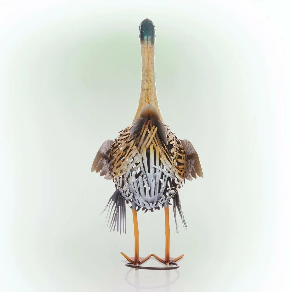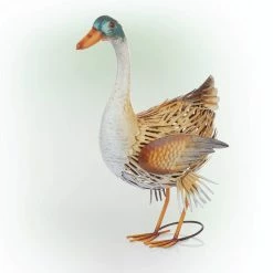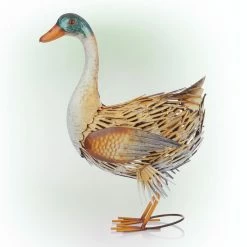 Add a bold accent to your indoor or outdoor space with the Alpine Corporation Metal Standing Duck Garden Decoration. This metal lawn figurine features a standing gold feathered duck with a green head to offer a friendly welcome to your guests. This stunning statue can be placed on its own or paired with multiple statues to create an artful display. It can also be used as a decorative accent in your flowerbeds, as a table centerpiece, or as part of your home’s interior decor. Made from durable metal, this lawn decoration is weather-resistant and rust-resistant for years of quality use. This metal bird statue measures 13 in. L x 7 in. W x 20 in. H to make a statement indoors and outdoors, and it includes a one year manufacturer’s warranty from date of purchase. Alpine Corporation is one of America’s leading designers, importers, and distributors of superior quality home and garden decor products. Alpine’s award winning in-house design team continuously develops new and innovative in.statements-pieces in. for your home and garden. Your outdoor living spaces will be the envy of the neighborhood with our wide assortment of fresh, fashionable and contemporary products, from beautifully crafted solar garden stakes featuring patented motion and fiber optic lighting technology to beautiful fountains and delightful bird baths and feeders.