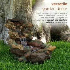 - Versatile garden decor: contemporary cascading tabletop water fountain with natural look and cool white LED lights will provide a tranquil and soothing addition to your indoor or outdoor living space