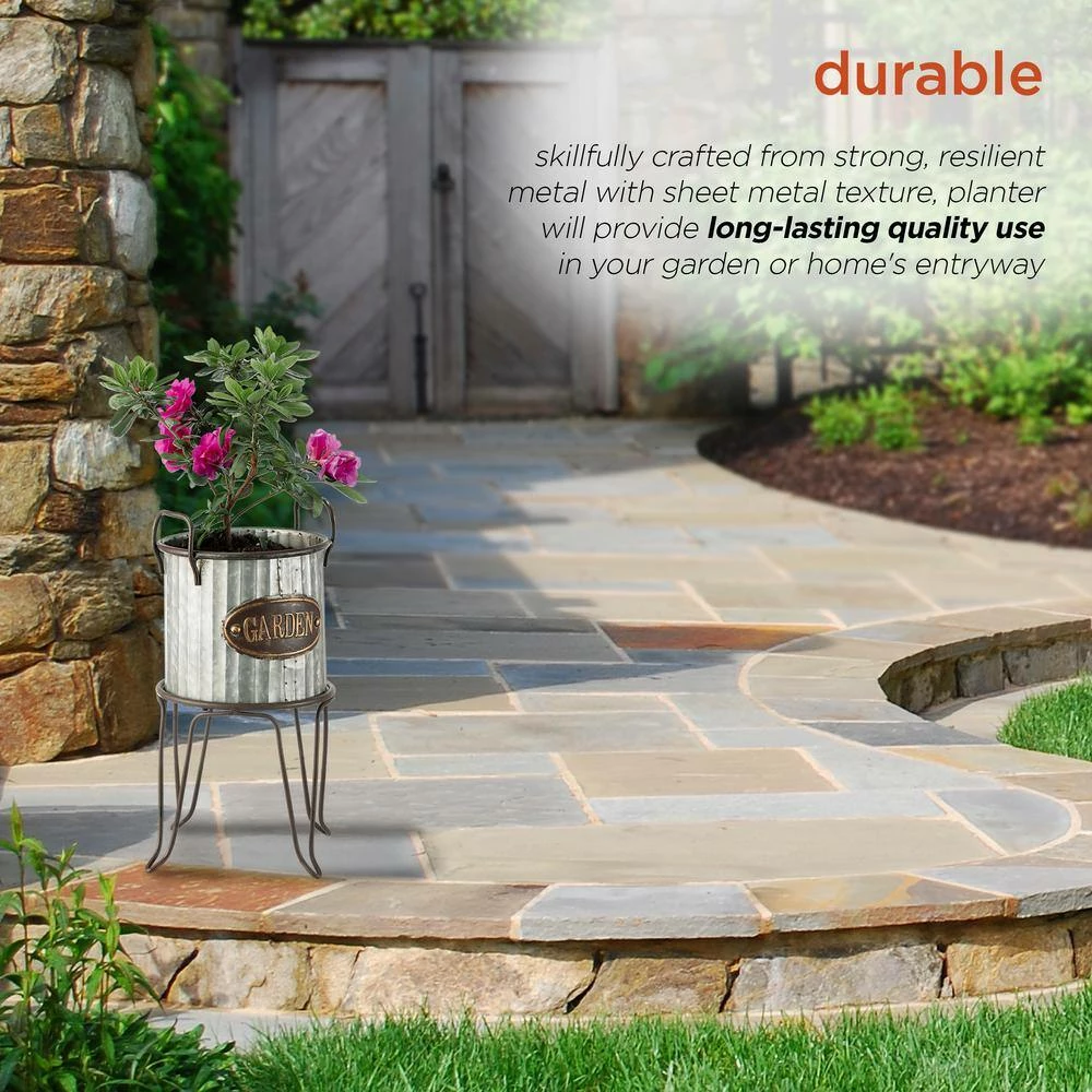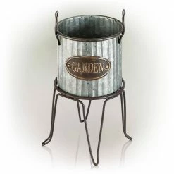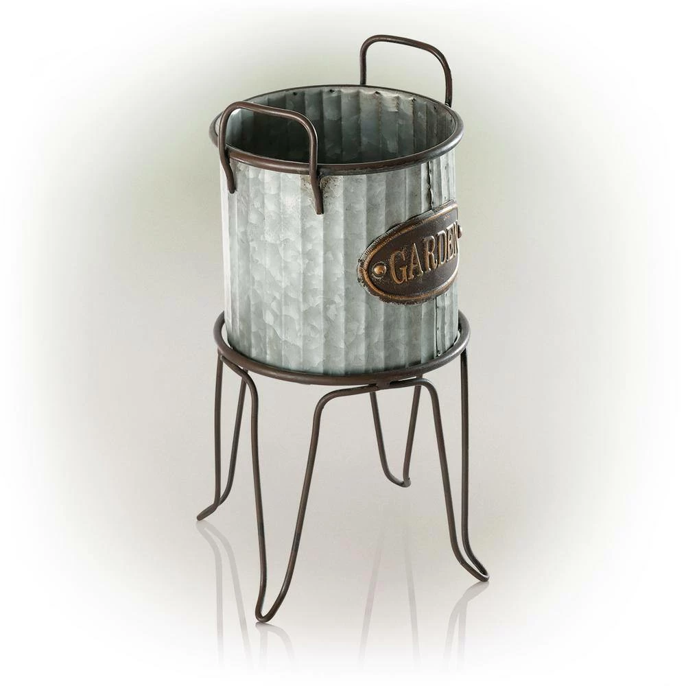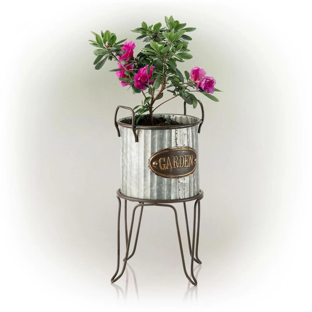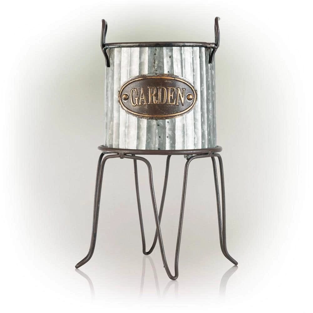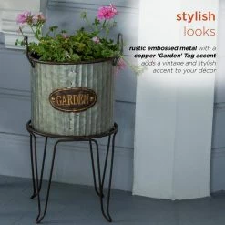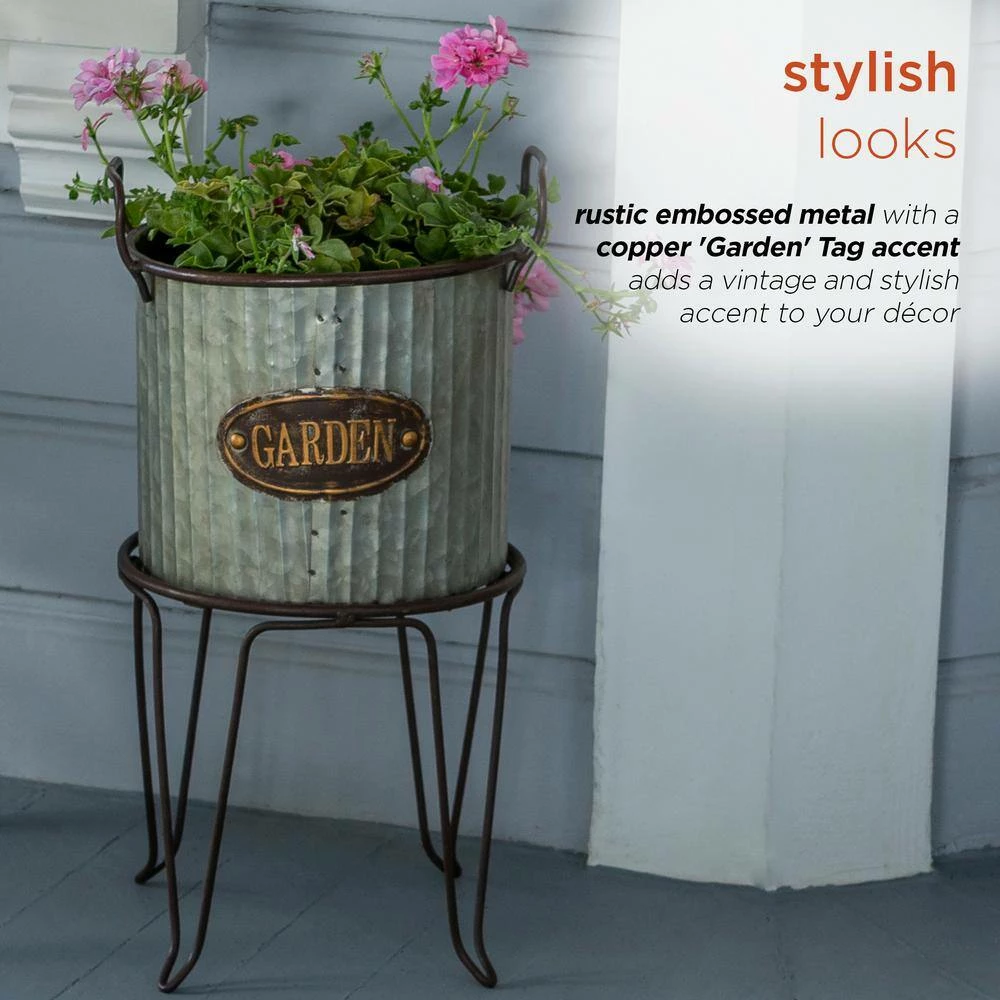 Bring beauty to your space with the Alpine Corporation Metal Tin Flower Planter with Stand. This durable, embossed metal planter with copper “Garden” tag accent will complement just about any Decor. Add some of your favorite small plants to brighten up even the smallest of spaces. The rustic-themed design is an attractive accent to your plants and adds a sense of comfort to your garden. Simply line your walkways with these beautiful planters for your green thumb to be admired by passers-by. The stand keeps the planter off the ground and within easy reach to save your knees and backs from having to bend over or kneel. Use multiple planters together to create a small garden oasis, or separate them to bring sweet style to any space. The flower planter includes a 1-year limited manufacturer’s warranty for quality you can rely on. The Alpine Corporation Metal Tin Flower Planter with Stand measures 12 in. L x 11 in. W x 20 in. H, perfect for your yard.