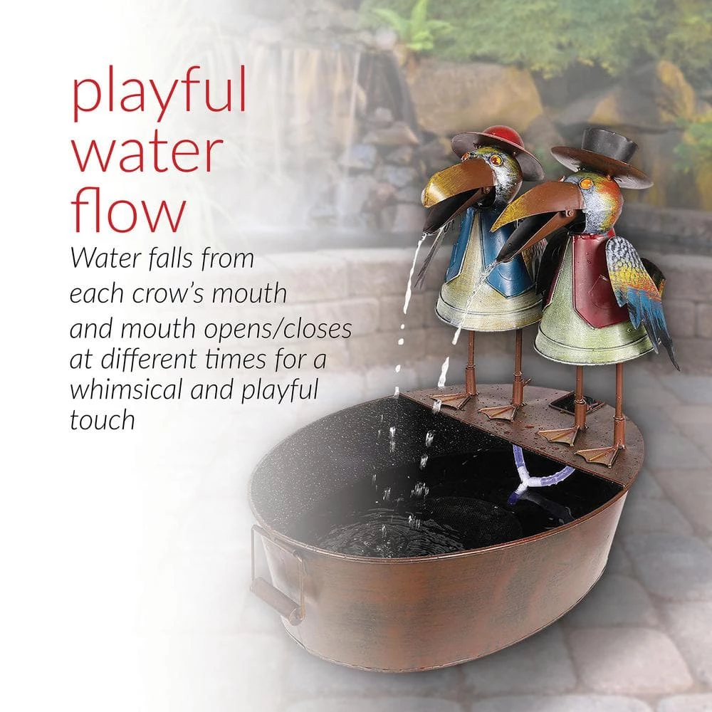 - Playful water flow: water falls from each crow’s opening and closing mouths at differing times for a whimsical and relaxing flow