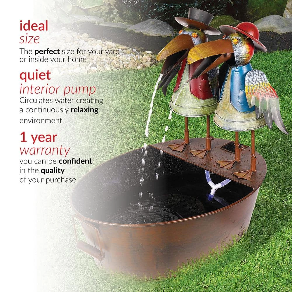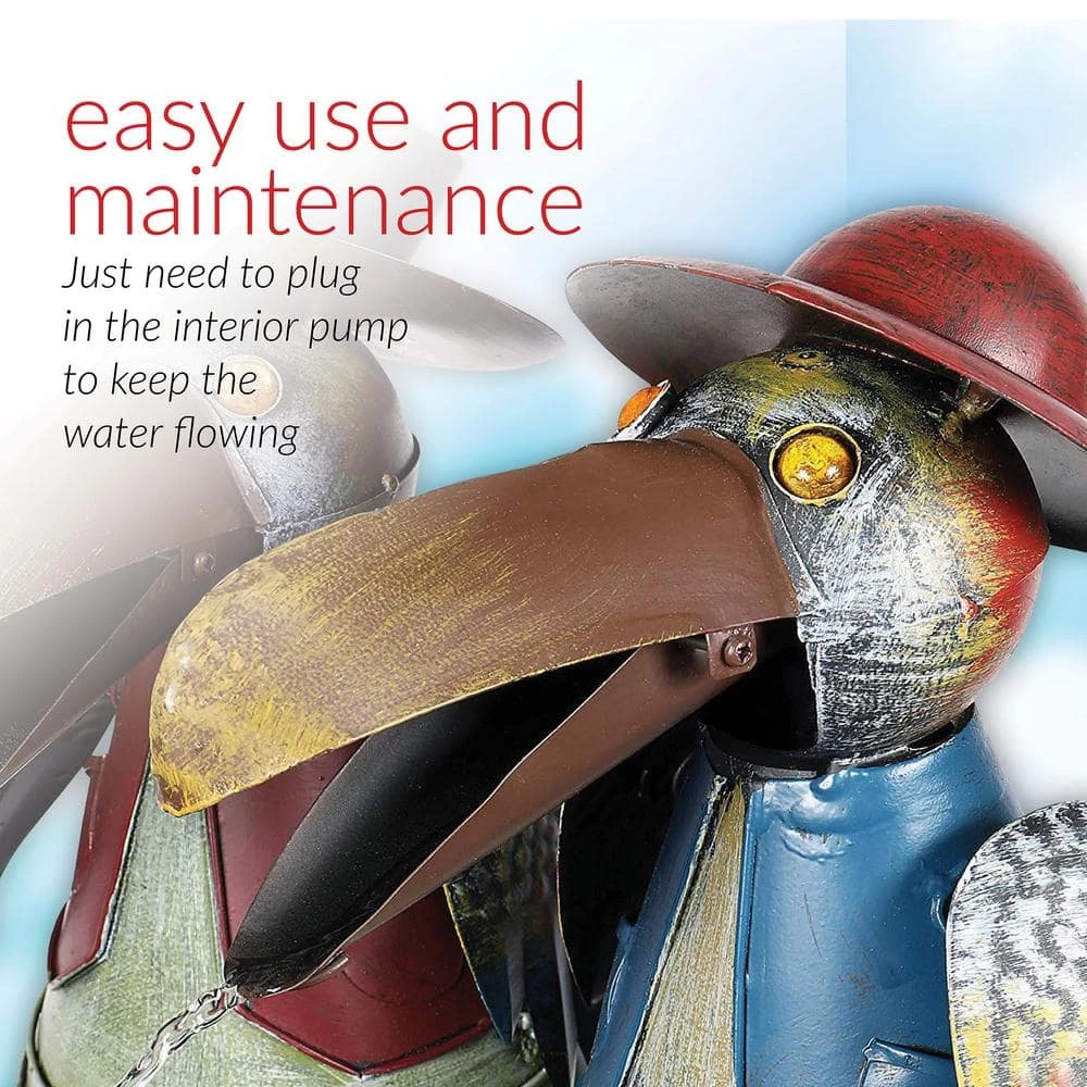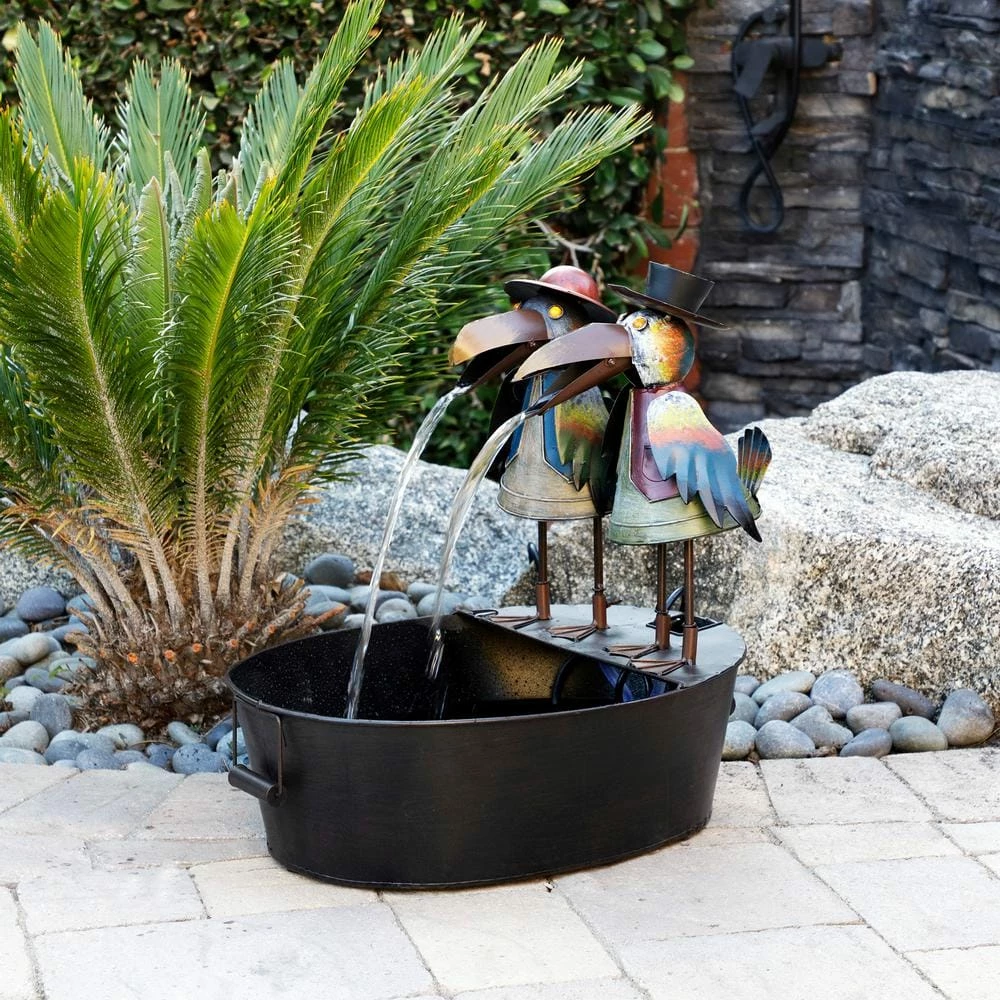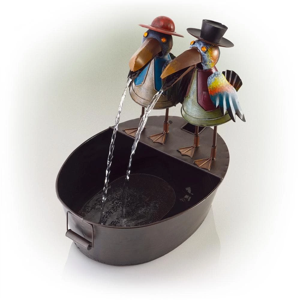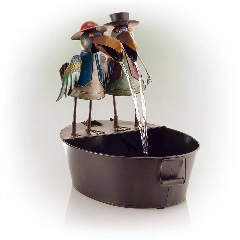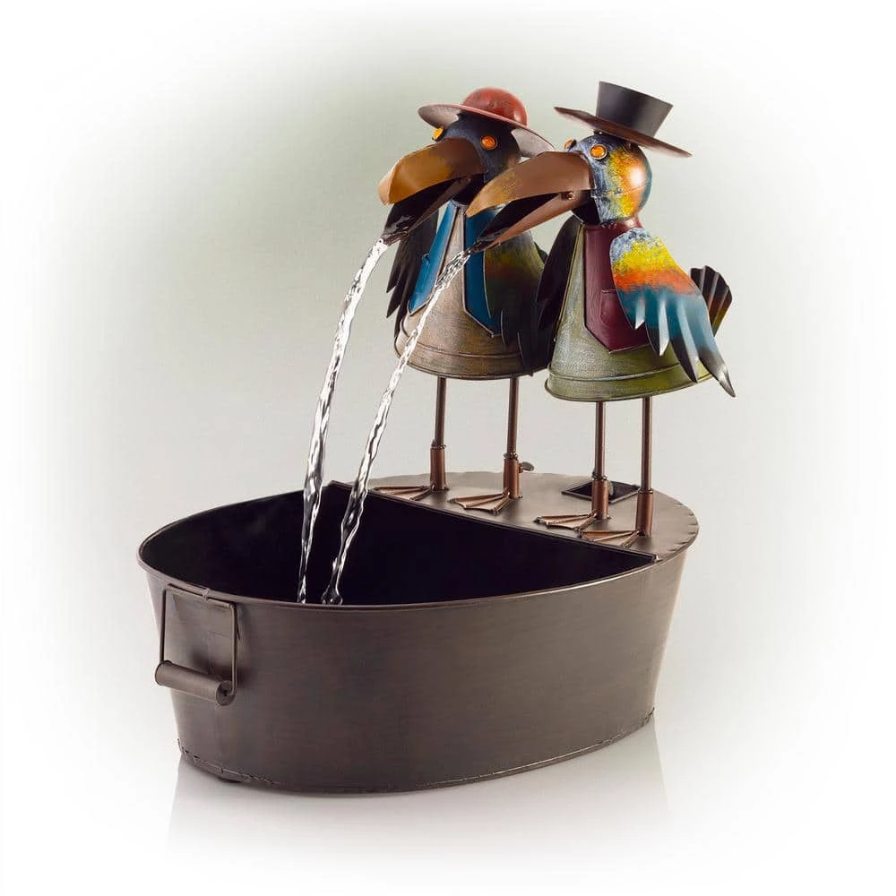 Add a touch of whimsy to your outdoor space with the Alpine Corporation Metal Bird Fountain. This small outdoor fountain looks great in your garden, patio, deck, porch, or yard. Enjoy the fun look of the crows’ opening and closing mouths rhythmically dispersing water. With gorgeous details on the crow’s clothing, wings, and eyes, the fountain is sure to delight anyone in your outdoor space. The tin construction is rust-resistant for years of quality use. To use, simply plug in to an outdoor outlet, fill basin with water, and watch as the interior pump creates a lovely water flow. With a 1-year warranty, you can be confident in the quality of your purchase. Fountain measures 20 in. L x 15 in. W x 20 in. H for use in compact spaces. Alpine Corporation is one of America’s leading designers, importers, and distributors of superior quality home and garden decor products. Alpine’s award winning in-house design team continuously develops new and innovative “statements pieces” for your home and garden. Your outdoor living spaces will be the envy of the neighborhood with our wide assortment of fresh, fashionable and contemporary products, from beautifully crafted solar garden stakes featuring patented motion and fiber optic lighting technology to gorgeous glass and glow-in-the-dark bird baths and feeders.