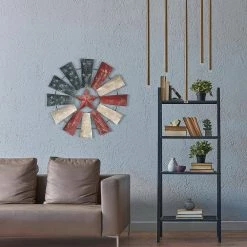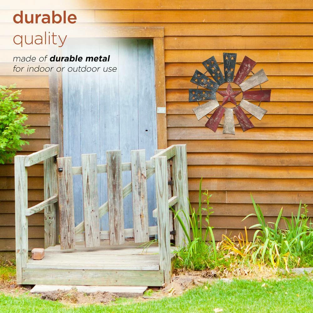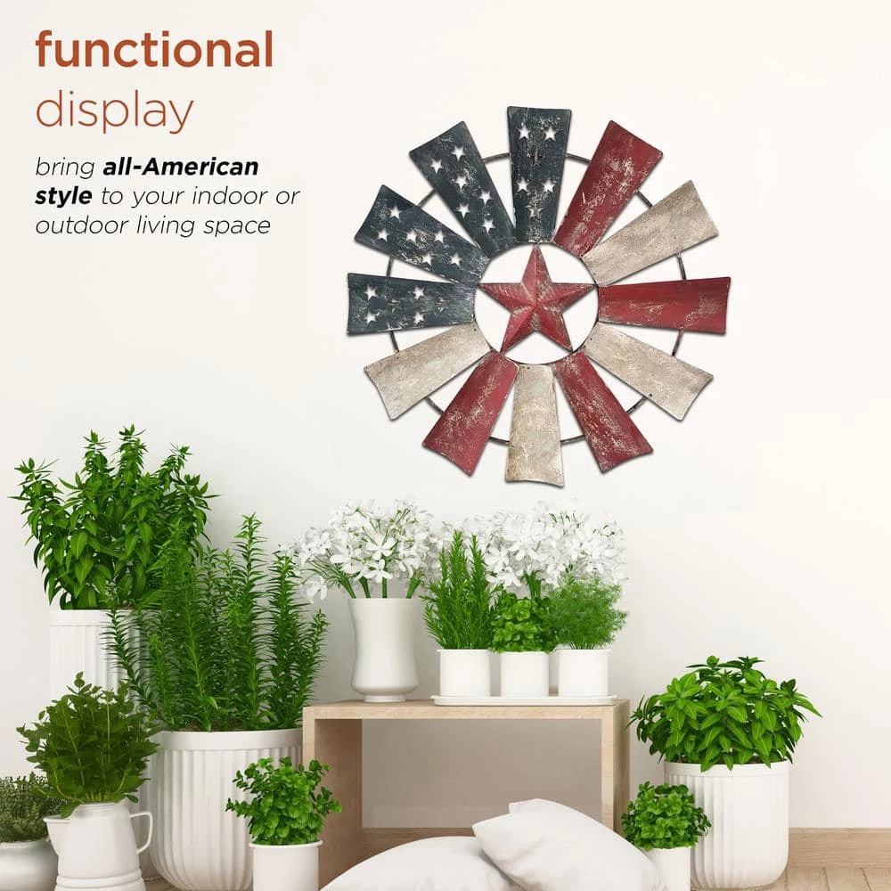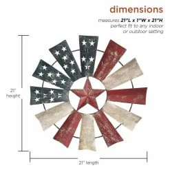 Add a classic Americana feel to your home and outdoor Decor with Alpine Corporation’s 21 in. tall Indoor/Outdoor Patriotic Windmill Wall Art Decor. This classic windmill accent art will provide a rustic addition to your indoor or outdoor space while providing a warm welcome to guests. Constructed from durable metal, this unique wall sculpture will be a cozy and timeless addition to your home. Featuring a charming and classic all-American design, this wall sculpture adds a decorative touch to your indoor or outdoor living area. This timeless and rustic wall art is a great addition to your living room, foyer, porch, or patio. This metal wall art measures 21 in. L x 1 in. W x 21 in. H to fit in any living space and includes a 1-year manufacturer’s warranty from date of purchase.Alpine Corporation is one of America’s leading designers, importers, and distributors of superior quality home and garden decor products. Alpine’s award winning in-house design team continuously develops new and innovative “statement pieces” for your home and garden. Your outdoor living spaces will be the envy of the neighborhood with our wide assortment of fresh, fashionable and contemporary products, from beautifully crafted solar garden stakes featuring patented motion and fiber optic lighting technology to gorgeous glass and glow-in-the-dark birdbaths and feeders.