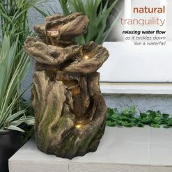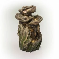 Relax to the sounds of nature with the Alpine Corporation 22 in. tall Outdoor Four-Tier Rainforest Log Waterfall Fountain with LED Lights. This cascading rainforest waterfall floor fountain provides a tranquil and soothing addition to your porch, backyard, or lawn. Constructed from durable polystone and fiberglass with a natural look and realistic textures, the fountain is weatherproof, rust-resistant, and resilient. This lawn statue will bring a touch of natural beauty to your outdoor space. Replicating natural wood and stone formations, the fountain becomes illuminated with the included white LED lights. The beautifully crafted wood and stone looking fountain imitates the natural drips of a forest. Relax to the sounds of the soft, natural water flow as it trickles down from the top tier of the fountain through the tiers of logs. Not only will the fountain provide you with serenity, it will also attract birds to your outdoor area, which in turn promotes healthy gardens. This floor fountain provides an elegant addition to your courtyard, patio, or yard, and gives your garden visual interest with its natural waterfall style. For quick installation and convenient operating, the fountain includes all necessary parts, as well as a pump, to begin creating an outdoor oasis. This standing fountain measures 15 in. L x 12 in. W x 22 in. H and includes a 1-year manufacturer’s warranty from date of purchase.