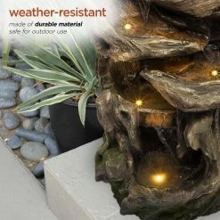 - Durable lawn statue: constructed from durable polystone and fiberglass with a realistic natural aged stone and wood look, the fountain is weatherproof, rust-resistant, and resilient