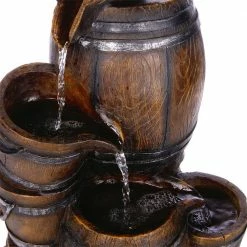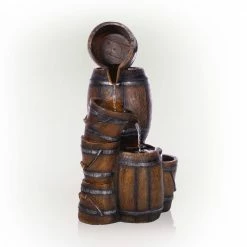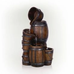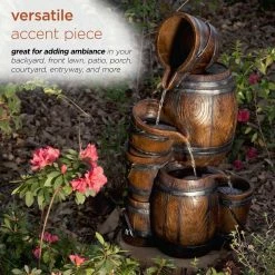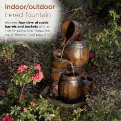 - Indoor/outdoor tiered fountain: features 4 tiers of rustic barrels and buckets with an interior pump that keeps the water flowing – just plug it in