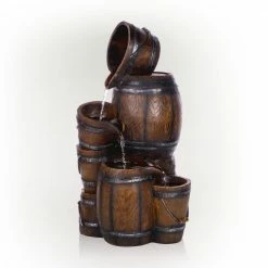 - Indoor/outdoor tiered fountain: features 4 tiers of rustic barrels and buckets with an interior pump that keeps the water flowing – just plug it in