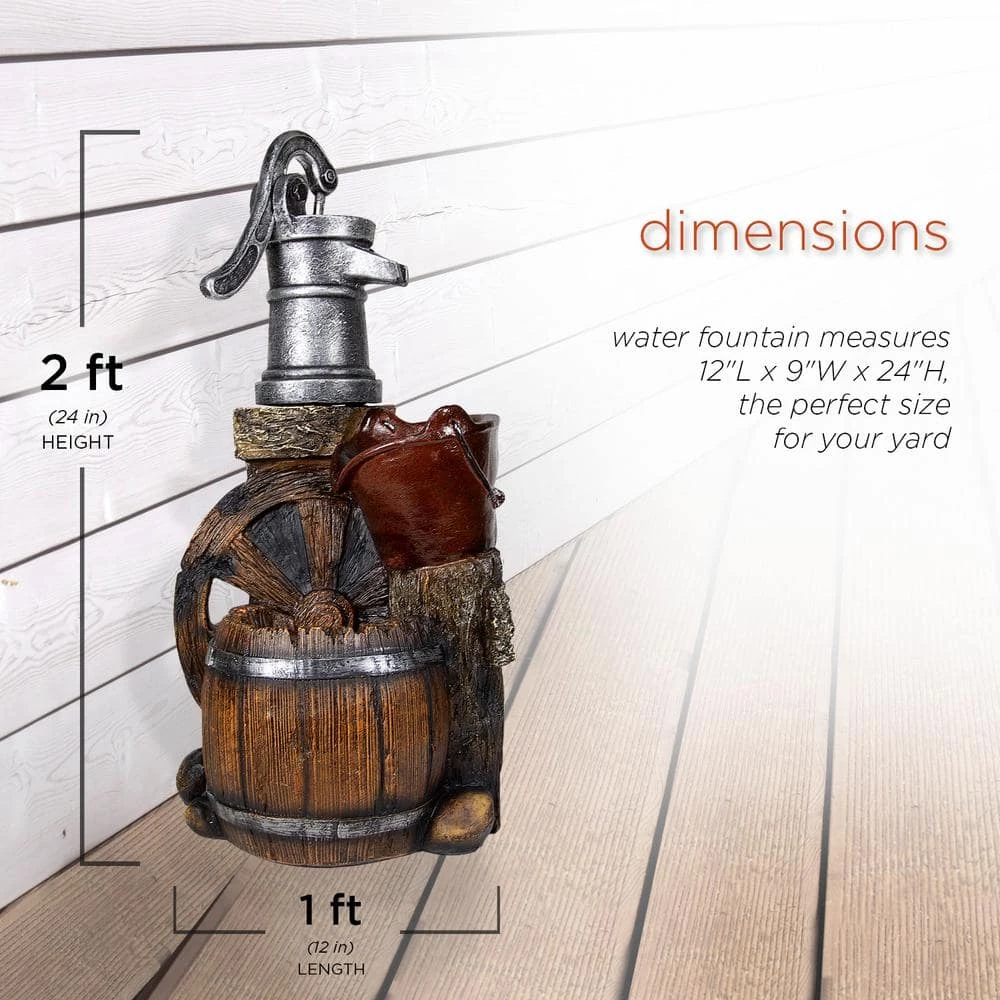 - Rustic look: fountain includes pump, bucket, barrel, stone, and wagon wheel elements for an old-fashioned western feel