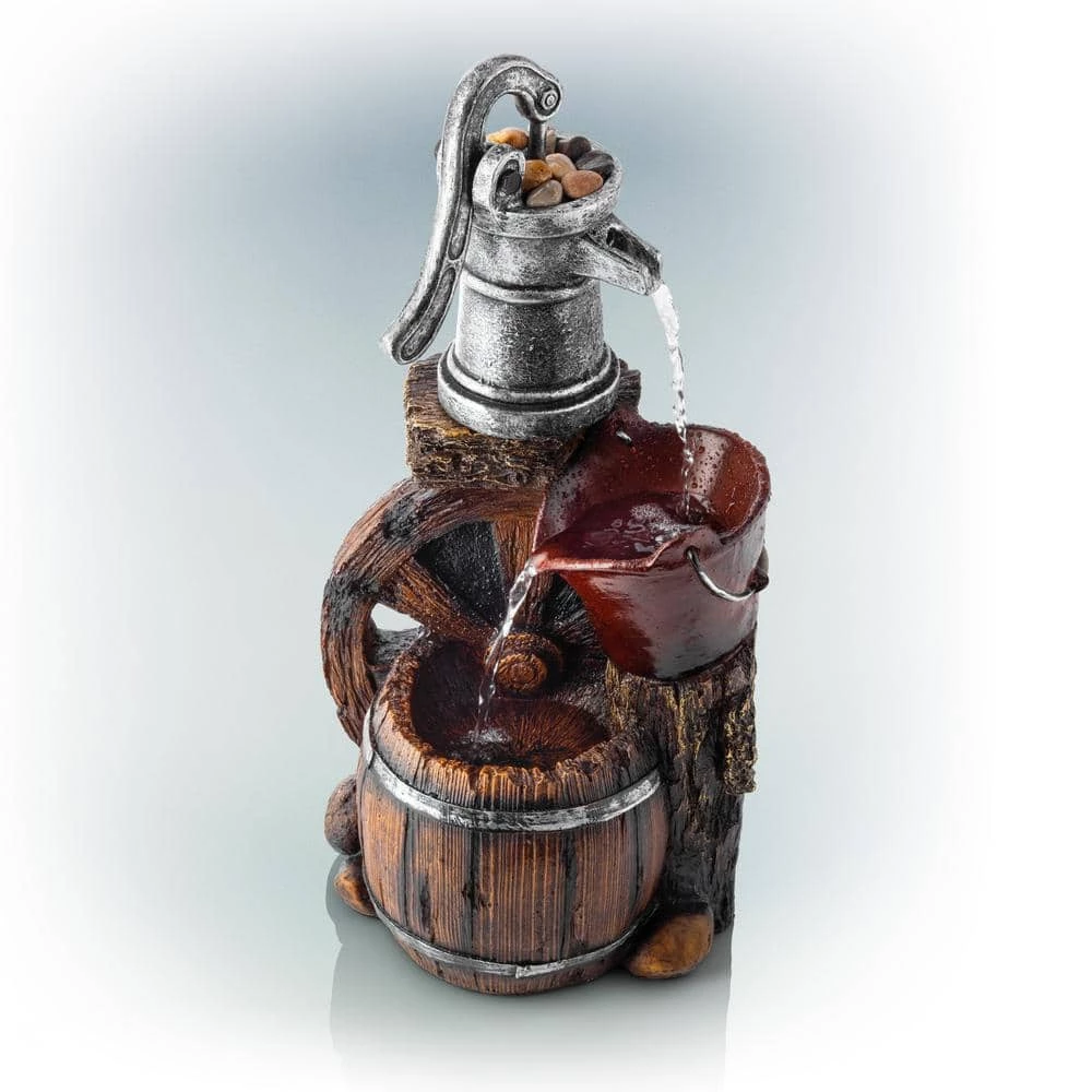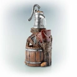 Enhance your outdoor space with this Alpine Corporation Old-Fashioned Pump and Barrel Fountain. The included pump, bucket, barrel, stone, and wagon wheel elements provide an old-fashioned western feel as the water trickles down into barrel tiers. For lasting use, it features polyresin, stone powder and fiberglass construction that’s rust and weather resistant. Plug it in for easy operation.