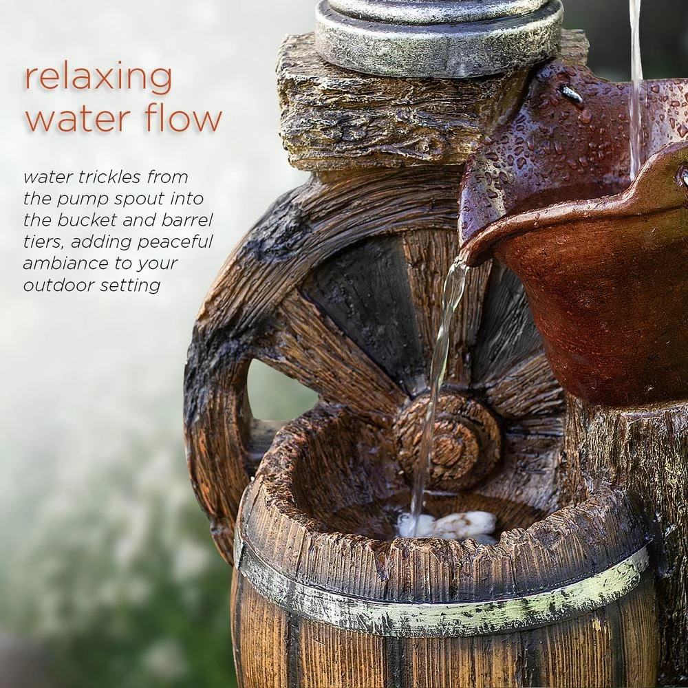 - Relaxing water flow: water trickles from the pump spout into the bucket and barrel tiers, adding a peaceful ambiance to your outdoor setting