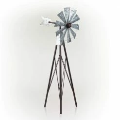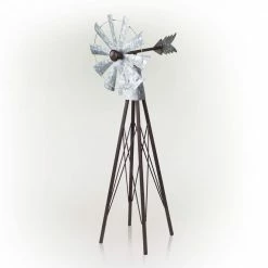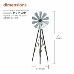 Welcome your guests with the 24 in. tall Outdoor Metal Windmill Spinner Garden Yard Decoration from Alpine. This bronze and silver colored outdoor yard art is made with 10 metal blades that replicate a windmill and add a breathtaking display of spinning movement and motion. Skillfully crafted from weather-resistant and sturdy iron, the all-season decorative spinner can be cleaned easily to keep its reflective shine and rustic appearance. Add one or multiple spinners to enhance your garden’s natural beauty with their eye-catching movements. Add an attractive outdoor display by lining several spinners along your driveway or front walkway or in your garden. All parts are included for a quick install and convenient outdoor decorating. The outdoor spinner can sit on a tabletop indoors or outdoors or along pathways or in your flowerbeds. This compact wind spinner measures 8 in. L x 11 in. W x 24 in. H and includes a 1-year manufacturer’s warranty from date of purchase.