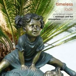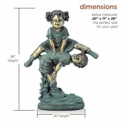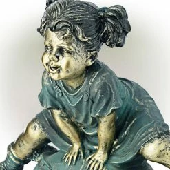 Add a touch of childish whimsy to your outdoor space with the Alpine Corporation Girl Jumping Over Boy Statue. This stunning statue is constructed with durable magnesium oxide with an antique bronze and patina finish to match any decor. The statue is weather-proof, rust-resistant, and durable for years of quality use. With its antique-look, intricate details and portrayal of timeless children, this Alpine statue is sure to bring peace and tranquility to your home. The statue is perfect for your garden, patio, deck, porch, or yard space. With a 1-year warranty, you can be confident in the quality of your purchase. Statue measures 20 in. L x 11 in. W x 26 in. H for use in yards of any size.Alpine Corporation is one of America’s leading designers, importers, and distributors of superior quality home and garden decor products. Alpine’s award winning in-house design team continuously develops new and innovative “statements pieces” for your home and garden. Your outdoor living spaces will be the envy of the neighborhood with our wide assortment of fresh, fashionable and contemporary products, from beautifully crafted solar garden stakes featuring patented motion and fiber optic lighting technology to gorgeous glass and glow-in-the-dark bird baths and feeders.