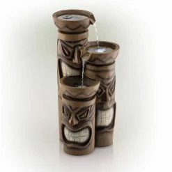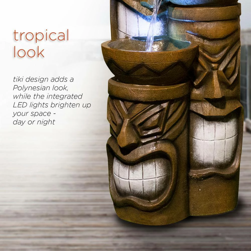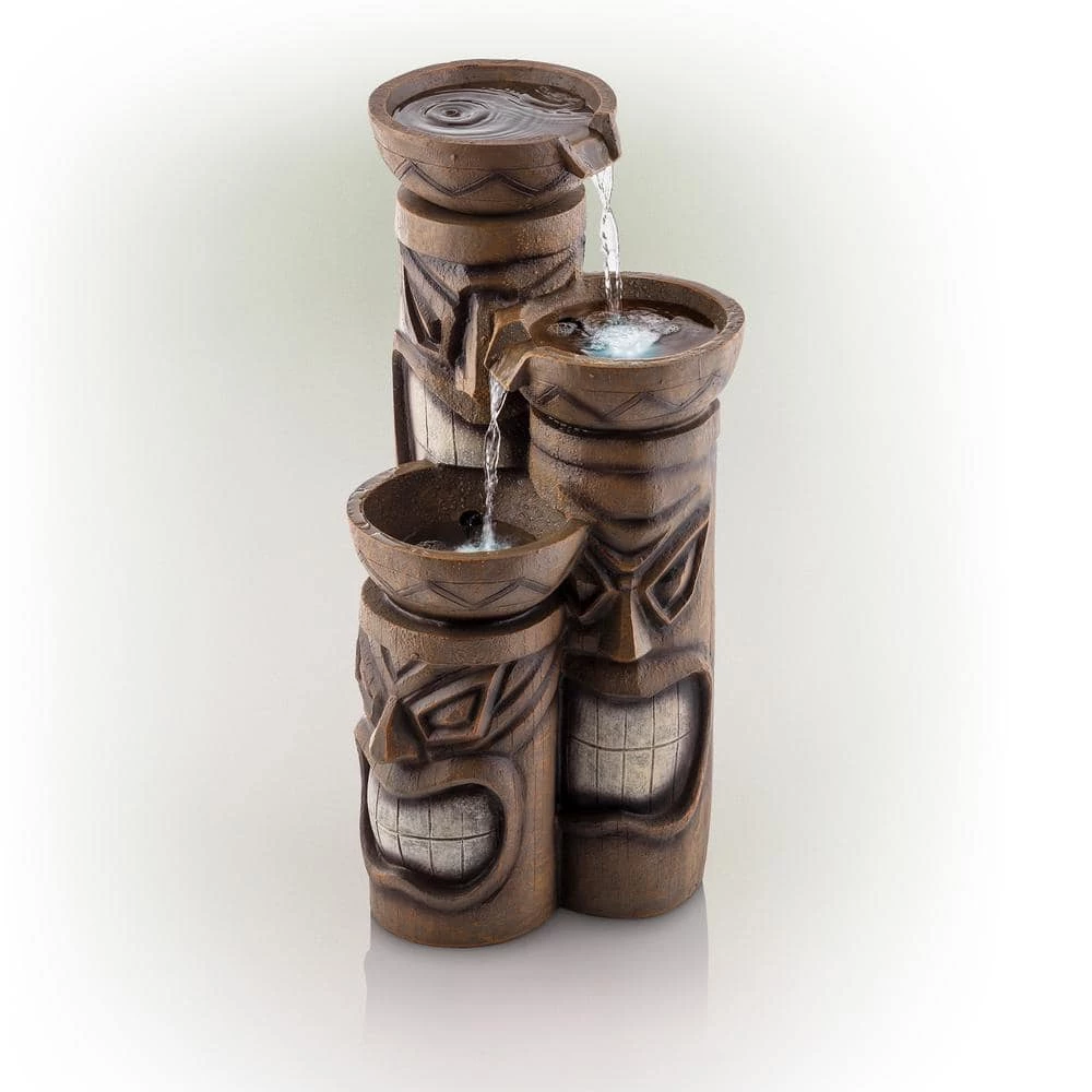 Add a touch of island fun to your outdoor space with the Alpine Corporation Tiki Head Fountain. Guests will be serenaded by the cascading streams and will feel like they are in the middle of the beach in Hawaii next to a tiki bar. This outdoor fountain looks great in your garden, patio, deck, porch, or yard space. Enjoy the sound of trickling water that pours from rounded bowls sitting atop three levels of tiki totem heads. The polyresin, stone powder, and fiberglass construction is weather-proof, rust-resistant, and durable for years of quality use. The weight of the fountain and sturdy base allow it to stay upright in the strongest wind. LED lights in each of the 3 tiers illuminate your space, drawing attention to the relaxing water pools day or night for added ambiance. To use, simply plug in to an outdoor outlet, fill upper level with water, and watch as the interior pump creates a lovely water flow. With a 1-year warranty, you can be confident in the quality of your purchase. Fountain measures 15 in. L x 15 in. W x 29 in. H for use in yards of any size.