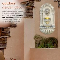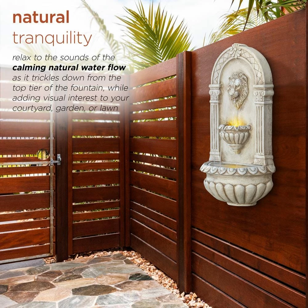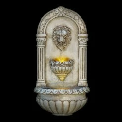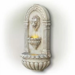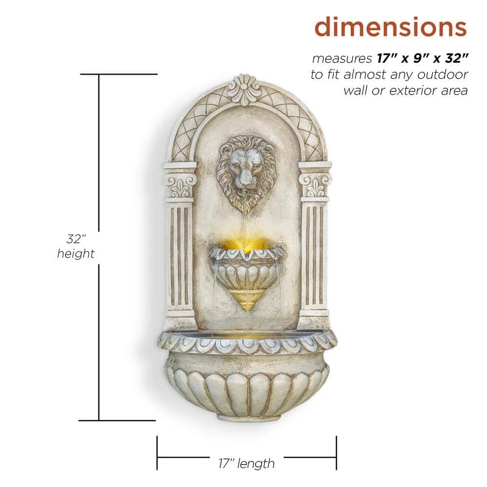 Elevate your home’s outdoor appearance with this elegant 32 in. Tall Outdoor Classical Wall-Mounted Water Fountain with Lion Head and LED Lights from Alpine. This fountain wall statue provides a tranquil and soothing addition to your porch, backyard, or sunroom. Constructed from durable resin, stone powder and fiberglass with a classical look, the fountain is weatherproof, rust-resistant, and resilient. This wall-mounted statue will bring a touch of Old World European sophistication to your outdoor space. Replicating an exquisite European Renaissance statue, the fountain becomes illuminated with the included 7 warm white LED lights, and is sure to light up your garden or patio. Relax to the sounds of the soft, natural water flow as it trickles down from the top tier of the fountain to the basin. Not only will the fountain provide you with serenity, it will also add a breathtaking display of power and strength represented by the lion head vignette. This majestic wall fountain provides an elegant addition to your courtyard, and gives your garden visual interest with its timeless design and classic style. For quick install and convenient operating, the water fountain includes all necessary parts and a pump, to begin creating an outdoor oasis. This wall-mounted water fountain measures 17 in. L x 9 in. W x 32 in. H to fit almost any outdoor space and includes a 1-year manufacturer’s warranty from date of purchase.