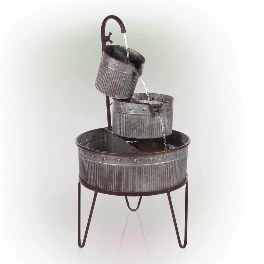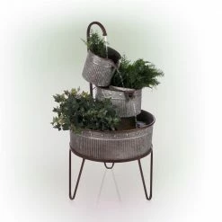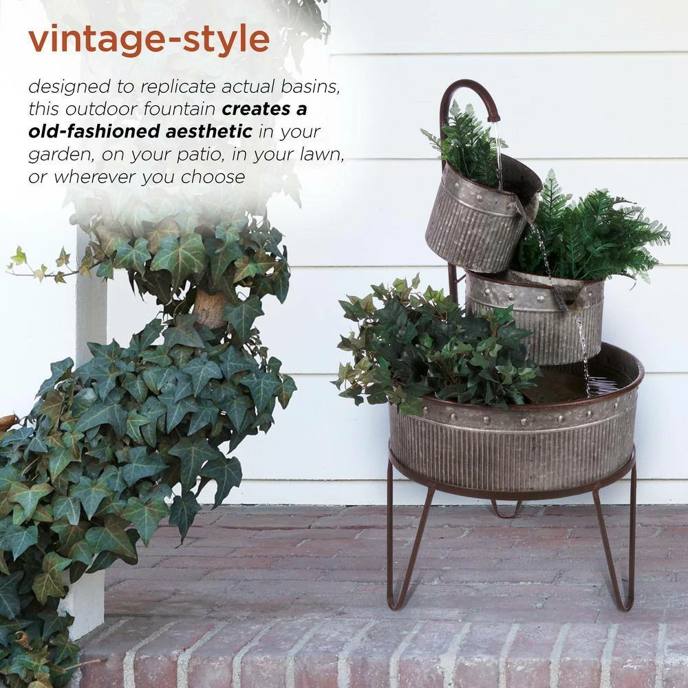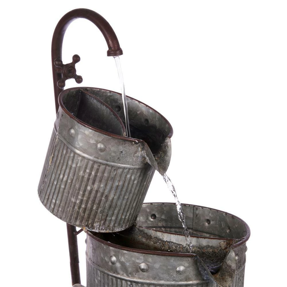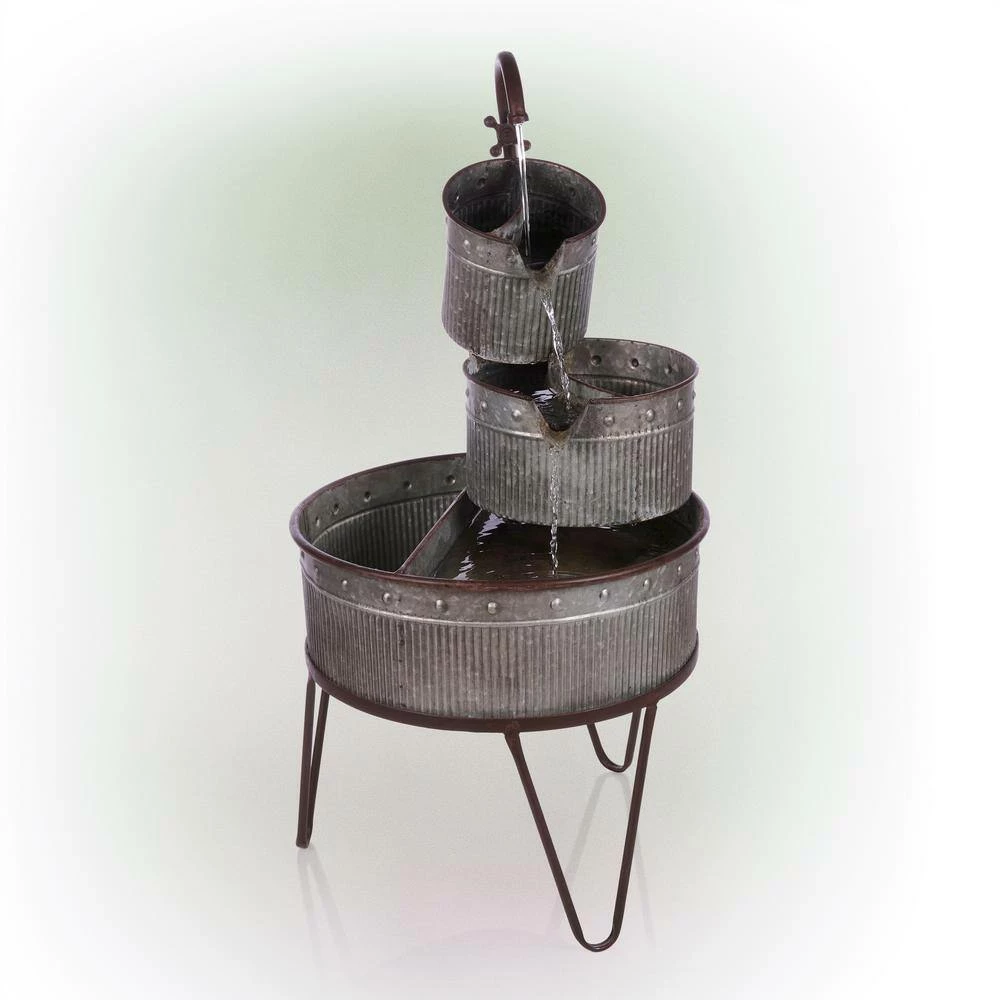 Hark back to earlier times with the Alpine Corporation 3-Tier Vintage Tubs and Planters Fountain. 3 tiered, rustic-appearing buckets emptying into a large galvanized metal tub create a farmhouse ambiance while providing a soothing effect for your outdoor space. Place in your yard, in your garden, or on your deck or patio for a pleasant, country touch to your lawn display. Each of the 3 levels provides a small section to place your plants or other decorative accents. Enjoy the soothing sounds of the running water function as you relax, garden, or enjoy other outdoor activities. This fountain is built from a weather and rust-resistant galvanized metal, so you will be able to enjoy this charming fountain for many years. This fountain measures at 19 in. x 18 in. x 33 in. and includes a 1-year manufacturer’s warranty from date of purchase. Alpine Corporation is one of America’s leading designers, importers, and distributors of superior quality home and garden decor products. Alpine’s award winning in-house design team continuously develops new and innovative statements pieces for your home and garden. Your outdoor living spaces will be the envy of the neighborhood with our wide assortment of fresh, fashionable and contemporary products, from beautifully crafted solar garden stakes featuring patented motion and fiber optic lighting technology to beautiful fountains and delightful bird baths and feeders.