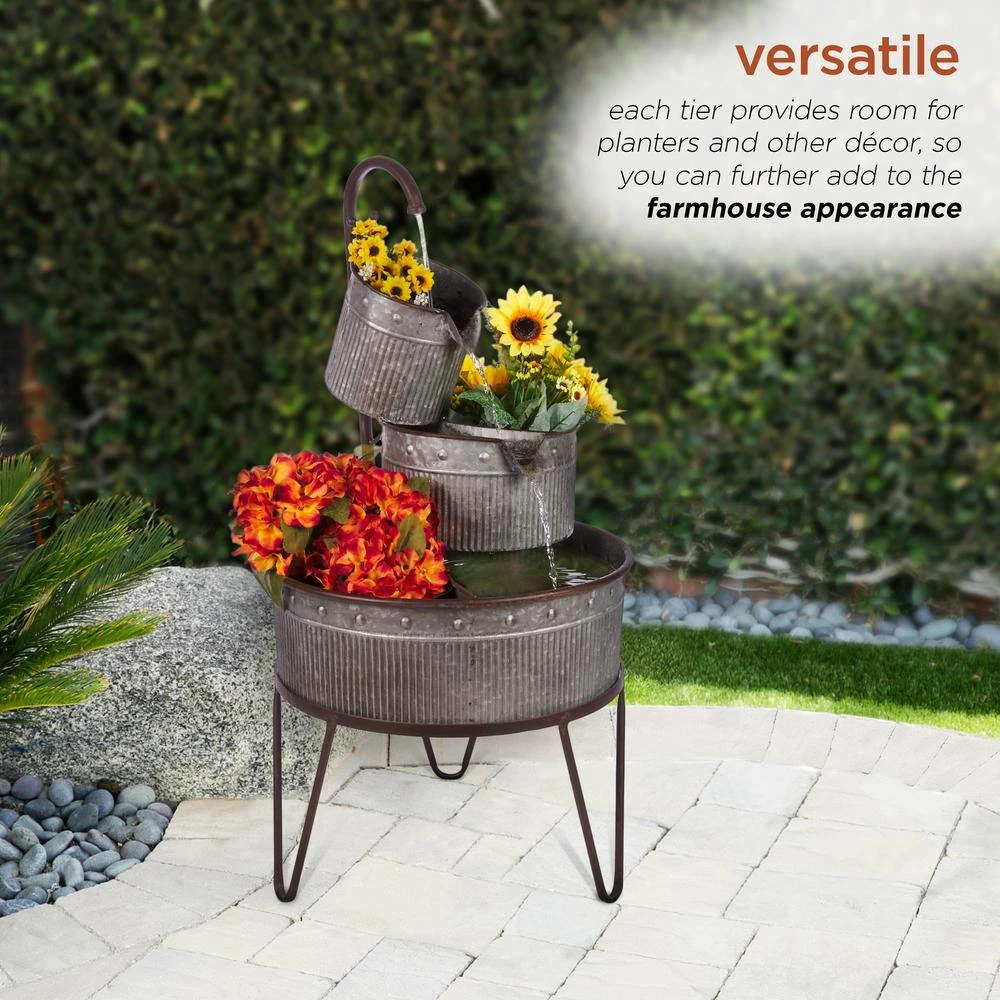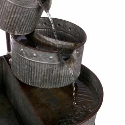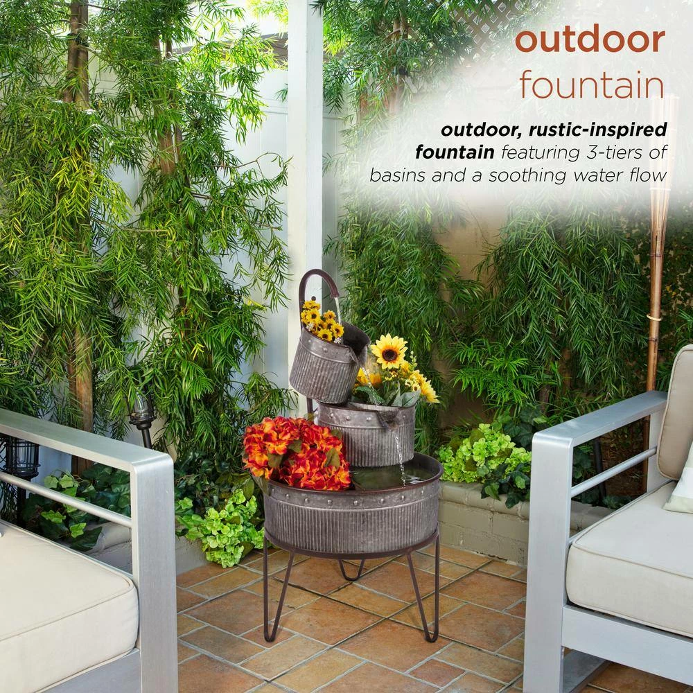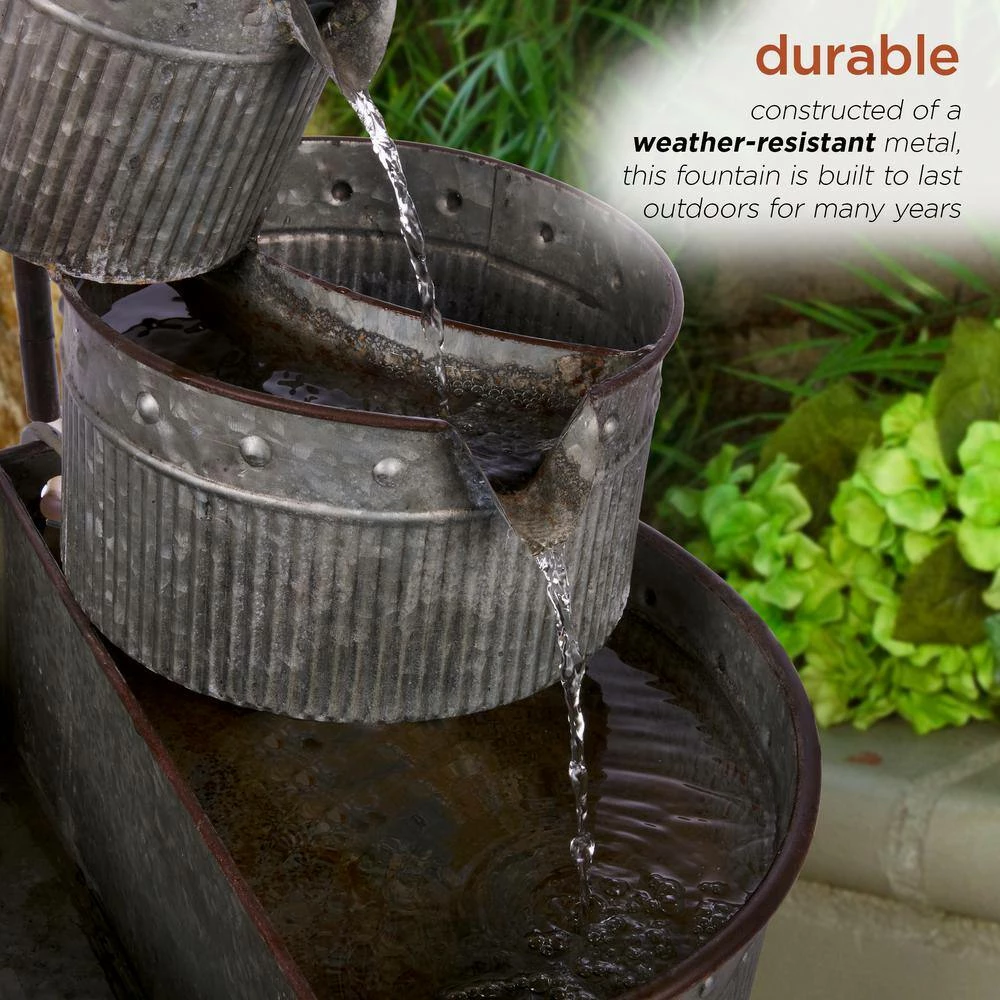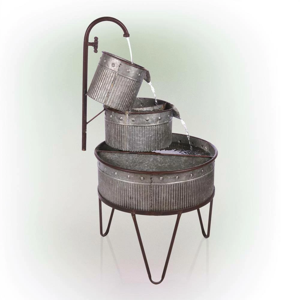 Hark back to earlier times with the Alpine Corporation 3-Tier Vintage Tubs and Planters Fountain. 3 tiered, rustic-appearing buckets emptying into a large galvanized metal tub create a farmhouse ambiance while providing a soothing effect for your outdoor space. Place in your yard, in your garden, or on your deck or patio for a pleasant, country touch to your lawn display. Each of the 3 levels provides a small section to place your plants or other decorative accents. Enjoy the soothing sounds of the running water function as you relax, garden, or enjoy other outdoor activities. This fountain is built from a weather and rust-resistant galvanized metal, so you will be able to enjoy this charming fountain for many years. This fountain measures at 19 in. x 18 in. x 33 in. and includes a 1-year manufacturer’s warranty from date of purchase. Alpine Corporation is one of America’s leading designers, importers, and distributors of superior quality home and garden decor products. Alpine’s award winning in-house design team continuously develops new and innovative statements pieces for your home and garden. Your outdoor living spaces will be the envy of the neighborhood with our wide assortment of fresh, fashionable and contemporary products, from beautifully crafted solar garden stakes featuring patented motion and fiber optic lighting technology to beautiful fountains and delightful bird baths and feeders.