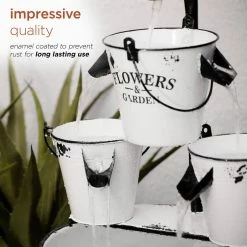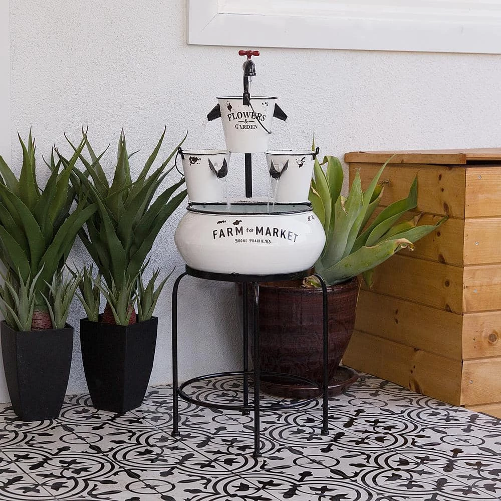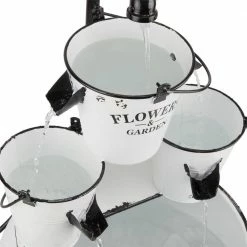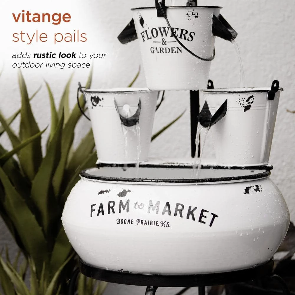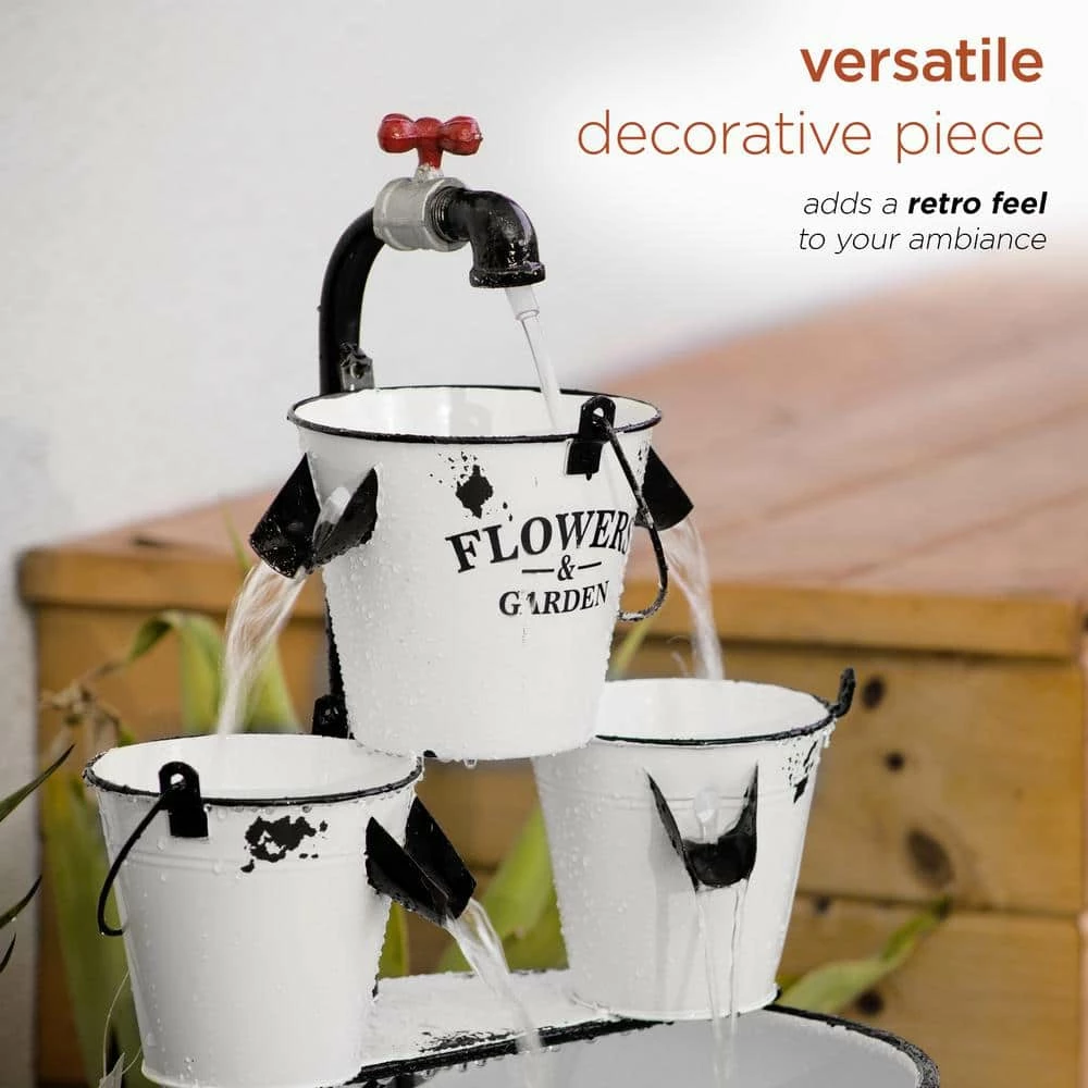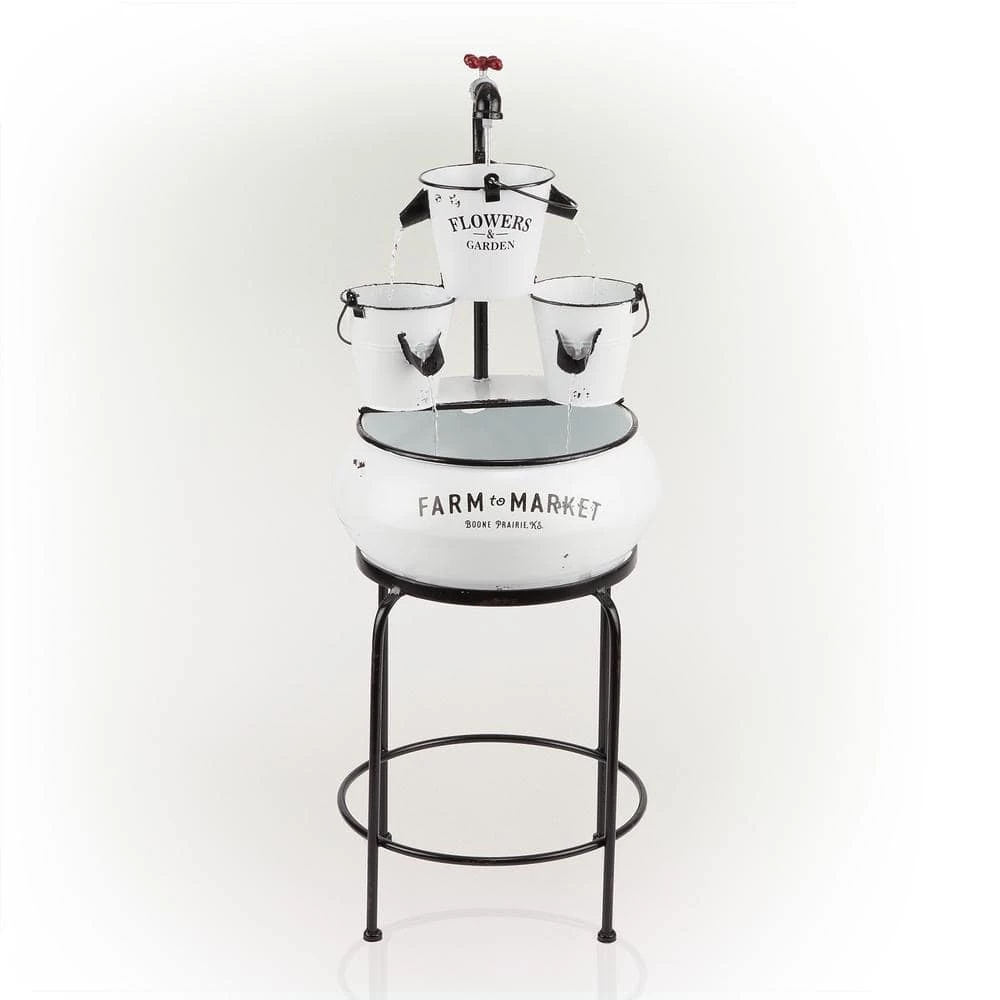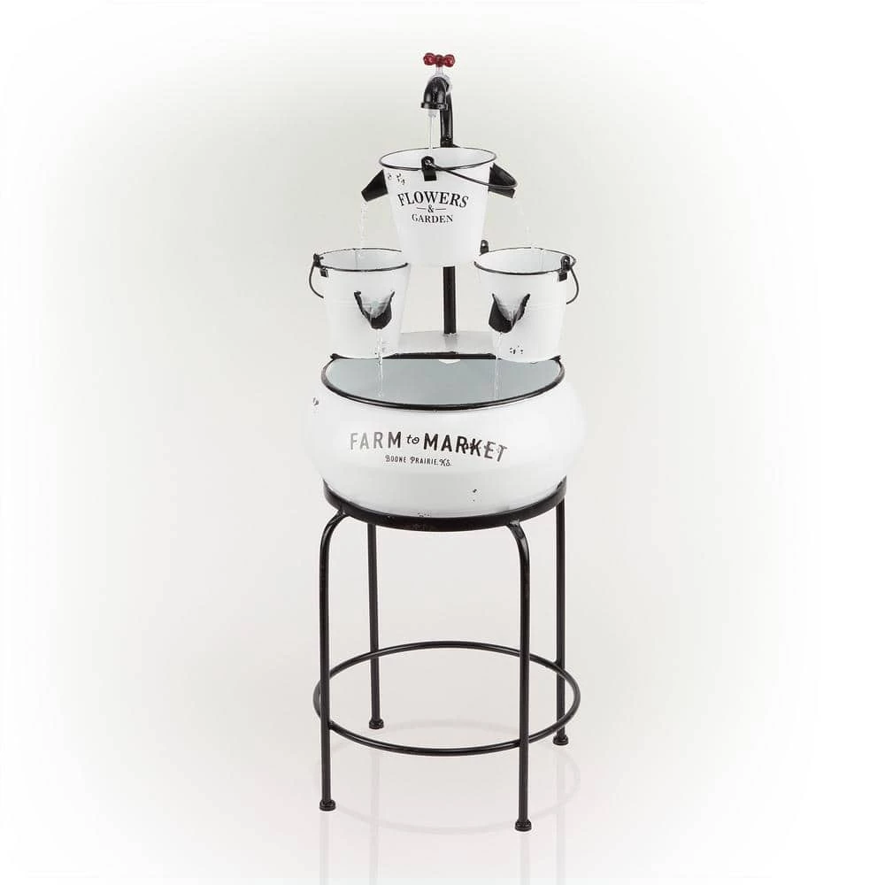 Add some old-fashioned charm to your home with this vintage-looking 36 in. tall White Buckets with Faucet Tabletop Fountain Decoration from Alpine Corporation. This fountain statue provides a tranquil and addition to your porch, backyard, or sunroom. Constructed from durable iron with a classic and antique look, the fountain is weatherproof and resilient. This statue will bring a touch of rustic charm to your outdoor space. Relax to the sounds of the soft, natural water flow as it trickles down through the buckets. Not only will the fountain provide you with serenity, it will also add a breathtaking display of beauty and retro charm to your outdoor area. This charming fountain provides a lovely throwback style to your courtyard, and gives your garden visual interest with its timeless design and classic style. For quick installation and convenient operating, the water fountain includes all necessary parts and a pump to begin creating an outdoor oasis. This decorative water fountain measures 15 in. L x 15 in. W x 36 in. H to fit almost any outdoor space and includes a 1-year manufacturer’s warranty from date of purchase.