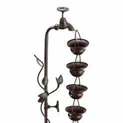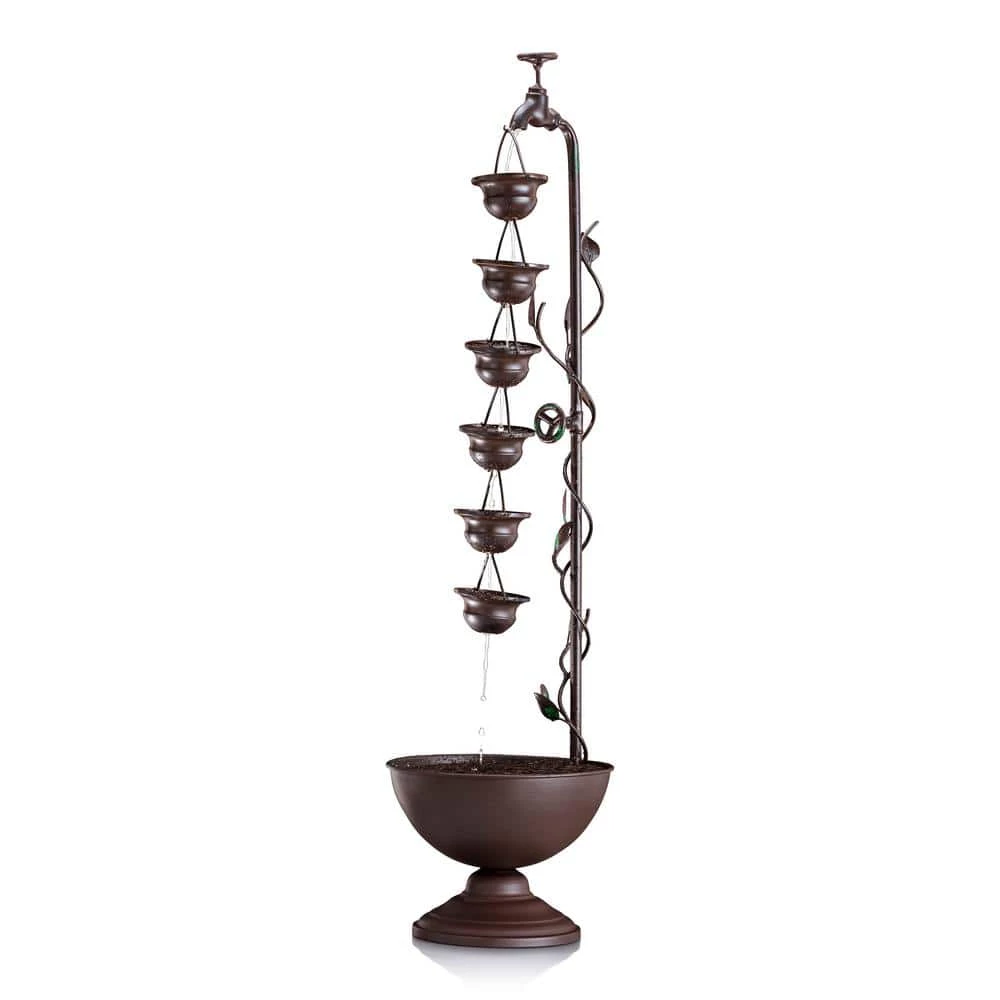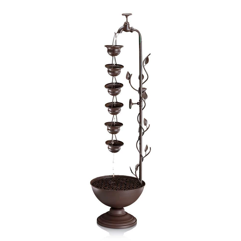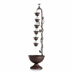 Bring calming ambiance to your space with the Alpine Corporation Hanging 6-Cup Tiered Floor Fountain. Set the mood for meditation or romance with this remarkable six-tier fountain. As water cascades from one cup to the next, it makes soft sounds to help you relax. The fountain is made of durable iron with a bronze finish to provide an attractive rustic look to your yard. To use, simply plug in to an outlet, fill lower basin with water, and watch as the interior pump creates a lovely water flow. With a 1-year warranty, you can be confident in the quality of your purchase. Fountain measures 10 in. L x 11 in. W x 38 in. H for a perfect fit in your office, bedroom, living room, hall, kitchen, and more.Alpine Corporation is one of America’s leading designers, importers, and distributors of superior quality home and garden decor products. Alpine’s award winning in-house design team continuously develops new and innovative “statements pieces” for your home and garden. Your outdoor living spaces will be the envy of the neighborhood with our wide assortment of fresh, fashionable and contemporary products, from beautifully crafted solar garden stakes featuring patented motion and fiber optic lighting technology to gorgeous glass and glow-in-the-dark bird baths and feeders.