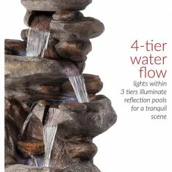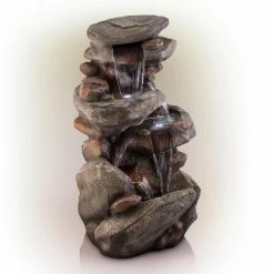Relax and enjoy the sounds of nature with the Alpine Corporation 4-Tier Rock Fountain. You will feel like you are sitting next to a majestic mountain stream in the great outdoors all while relaxing in your own backyard. This outdoor fountain looks great in your garden, patio, deck, porch, or yard space. Take in the tranquil sounds of the water gently cascading over natural-looking gray stone. The resin, stone powder, and fiberglass construction is weatherproof, rust-resistant, and durable for years of quality use. The three LED lights in the fountain tiers accent the movement of the trickling water for a subtle yet beautiful light source, day or night. To use, simply attach the pump to the hose, plug it into an outdoor outlet, fill the lower level with water, and watch as the interior pump creates a lovely water flow reminiscent of a lush rainforest. With a 1-year warranty, you can be confident in the quality of your purchase. Fountain measures 23 in. L x 18 in. W x 40 in. H for use in any indoor or outdoor setting.