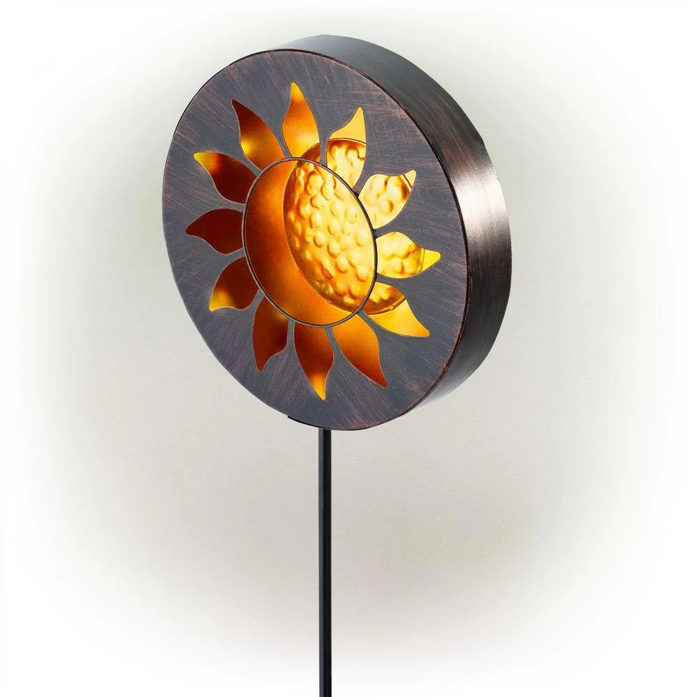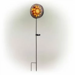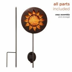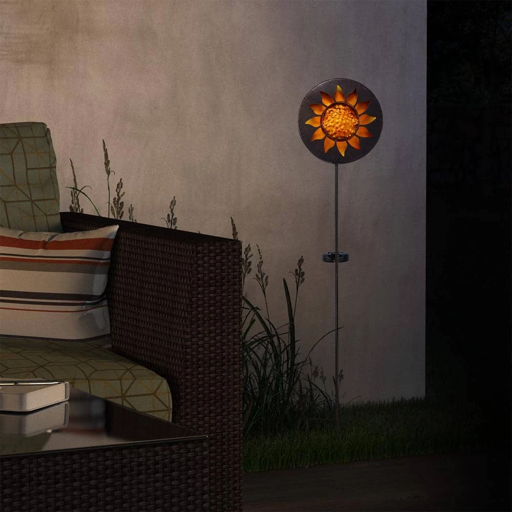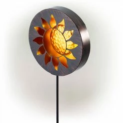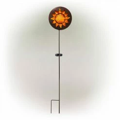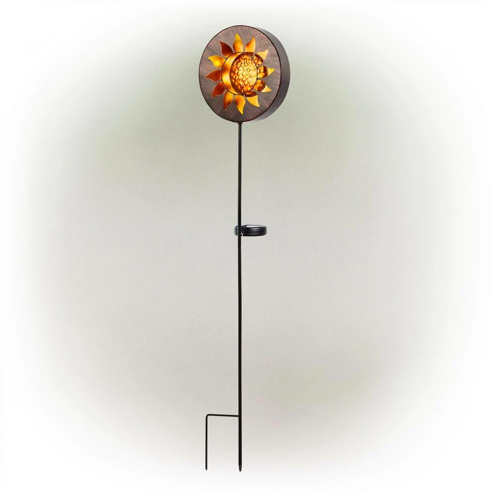 Add a fun, unique design to your outdoor area with the 40 in. tall Outdoor Solar Powered Garden Stake Sunflower Design with LED Lights from Alpine Corporation. This lighted garden stake features a sunflower shaped design and is powered by solar energy to provide a unique and decorative addition to your home’s exterior Decor. The lighted yard art is powered by solar energy to keep your outdoor yard stake lit up for up to 8 hours on one full charge and features 6 warm white long-lasting LED lights. Constructed from durable metal and other strong materials, the yard art is made tough for outdoor use and is weather-resistant for long-lasting, quality use in your front yard or backyard or along your sidewalk. Add one or multiple stakes to create an enchanted garden display. The garden stake is perfect for display on pathways, entryways, courtyards, and outdoor living spaces. For added convenience, the stake is attached to the metal flower for quick install. The decorative garden stake measures 9 in. L x 2 in. W x 40 in. H to fit almost any outdoor space, and includes a 1-year manufacturer’s warranty from date of purchase.